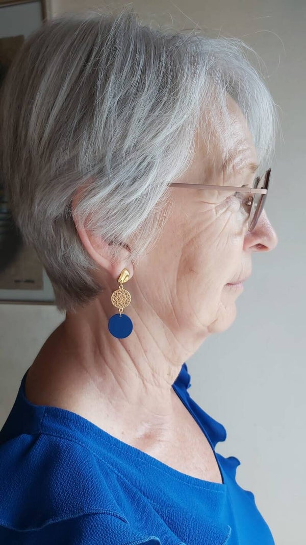 Een berubberd kobalt blauw schijfje en een mooi tussenelementje hangen aan een roestvrijstalen oorstekertje.Speels & licht om te dragen!