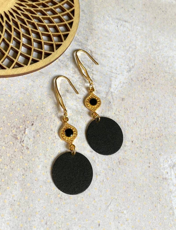 Een zwart metalen schijfje en een mooi tussenelementje hangen aan een roestvrijstalen oorhaakje.Speels & licht om te dragen!