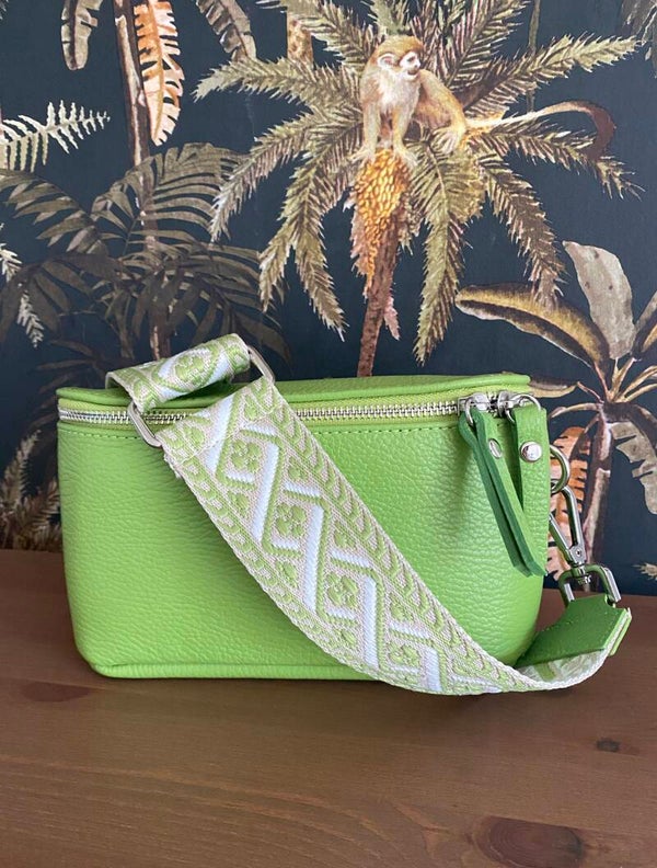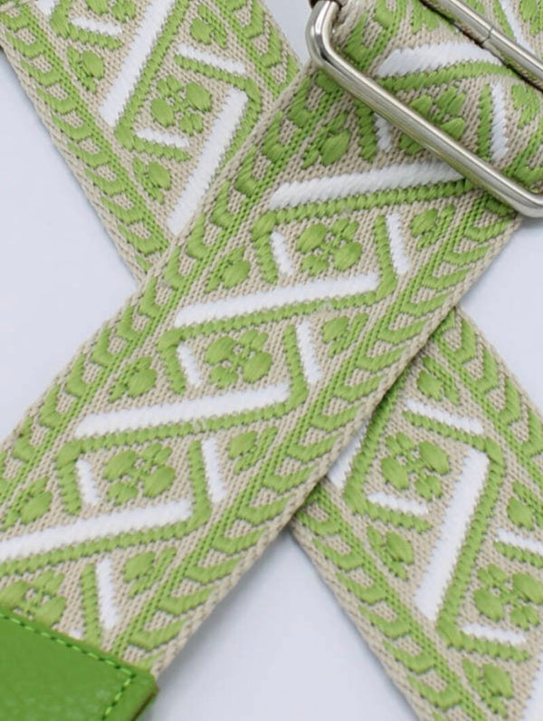Verstelbare stoffen tasriem met groene print en lederen afwerking.