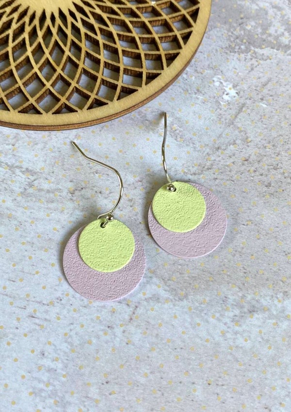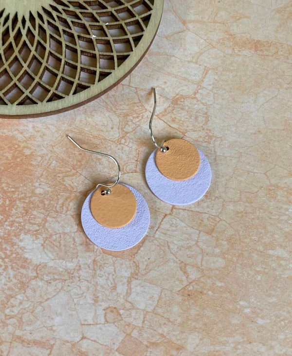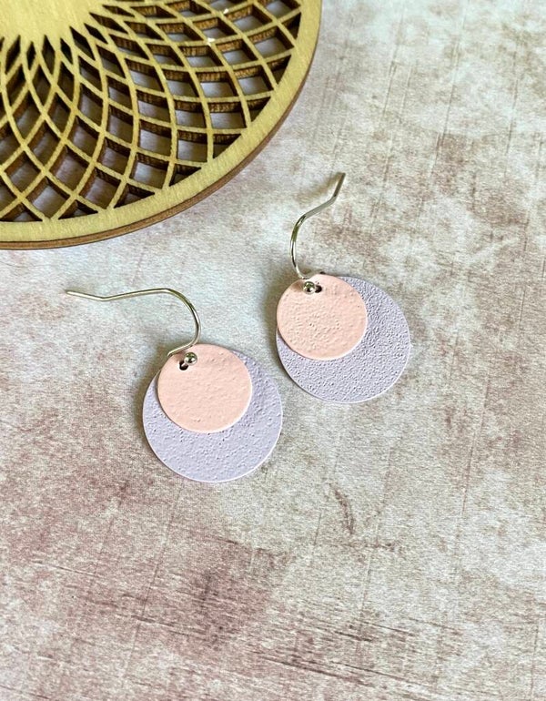 Nikkelvrije, zilverkleurige oorhangers met daaraan een schijfje met lila rubbercoating en daarbovenop een kleiner schijfje in een contrasterend kleur.