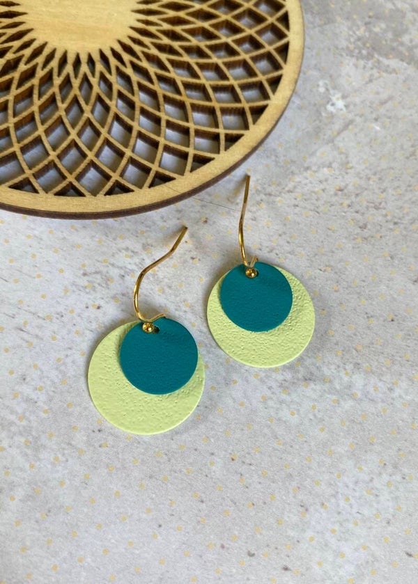 Nikkelvrije, zilver -of goudkleurige oorhangers met daaraan een schijfje met pastel oranje rubbercoating en daarbovenop een kleiner schijfje in een contrasterend kleur.