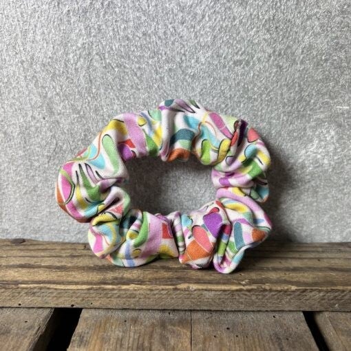 HandgemaaktModel: Scrunchie originalMateriaal: 80% bamboe 20% katoenKleur: MulticolorOmtrek: 12 cm