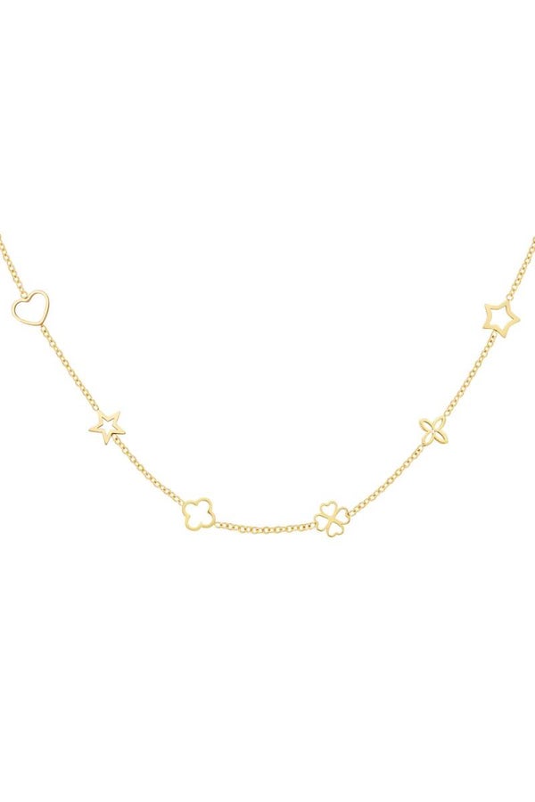 Leuke, gouden ketting met verschillende bedels in de vorm van een hartje, sterretjes, klavers en een bloempje.