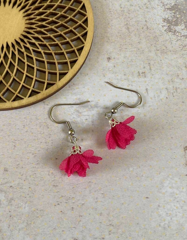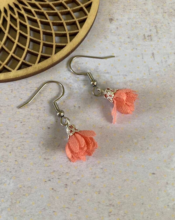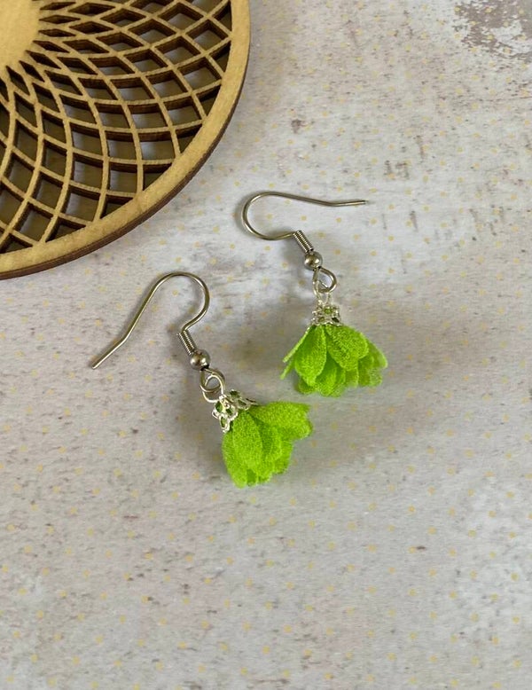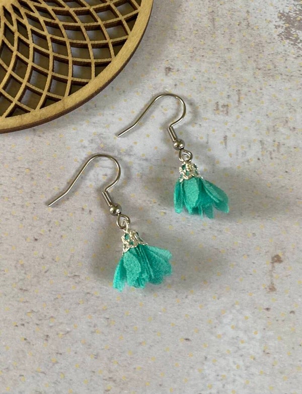 Een zilverkleurig oorhaakje van roestvrijstaal met daaraan een flosjke.