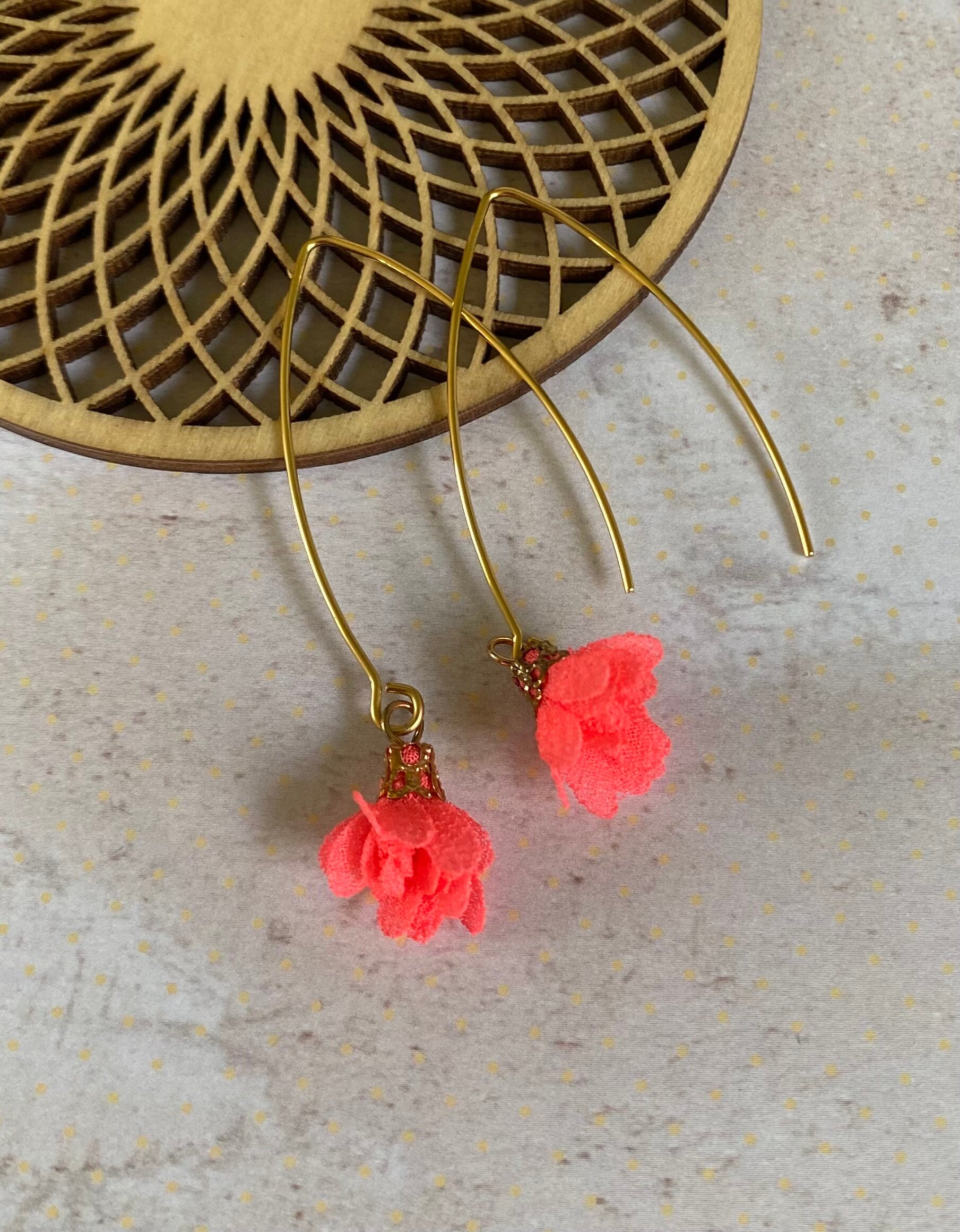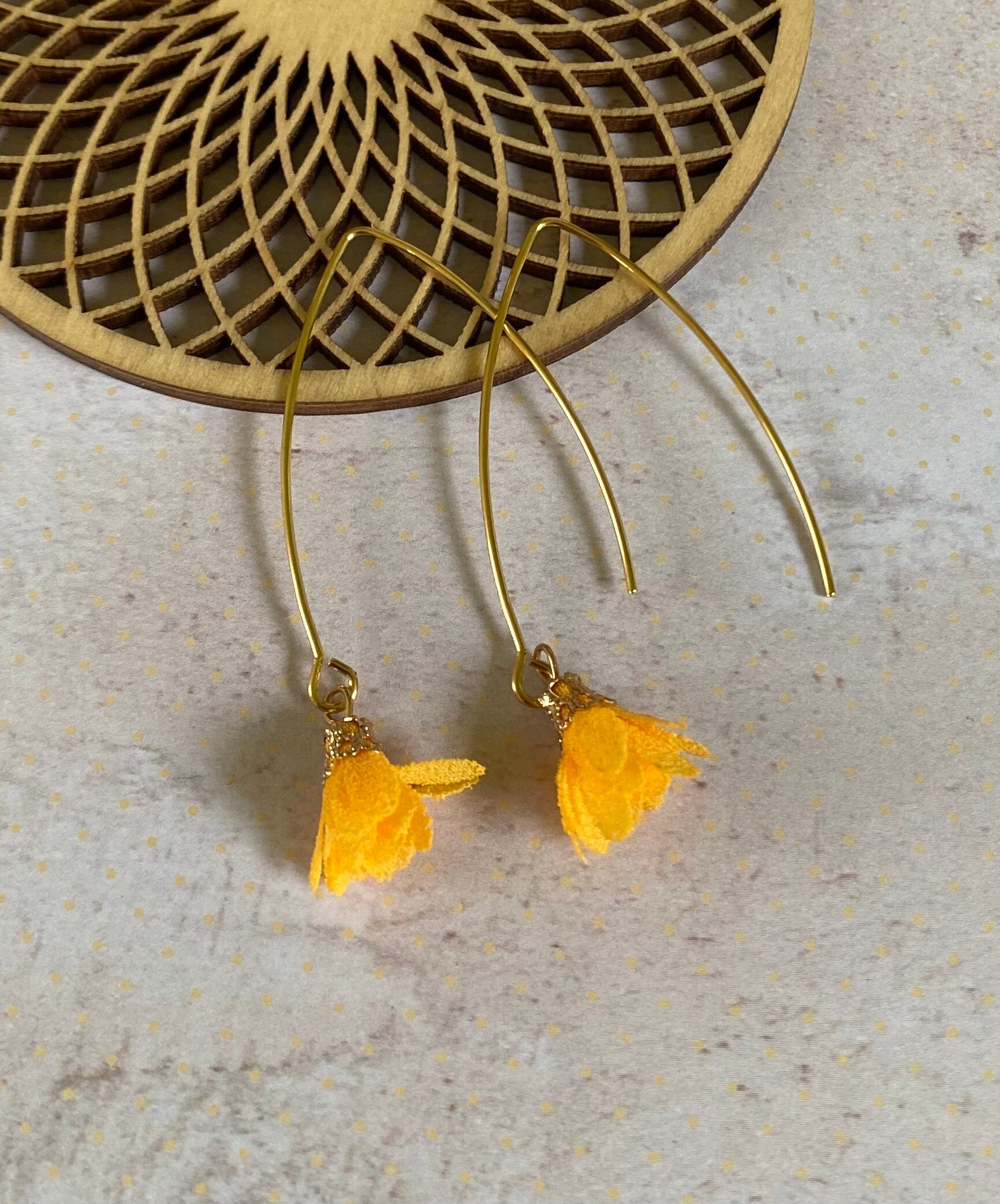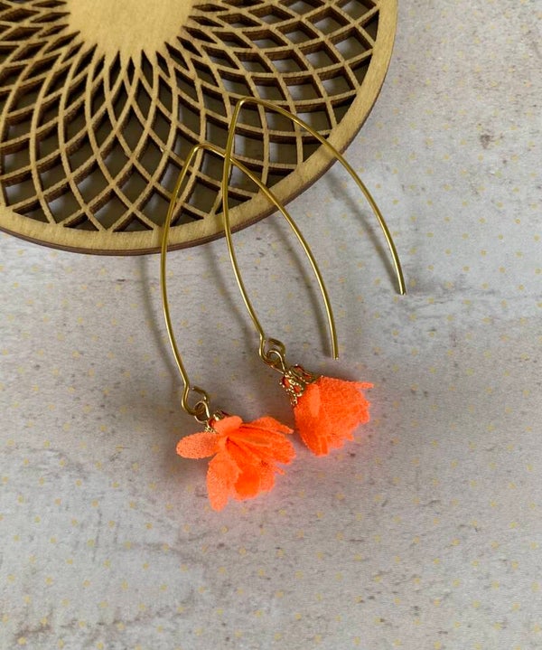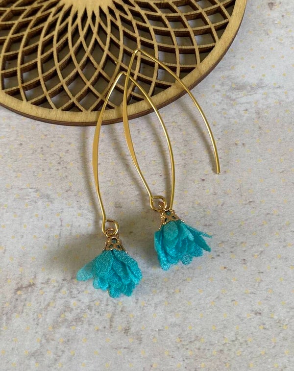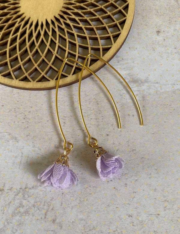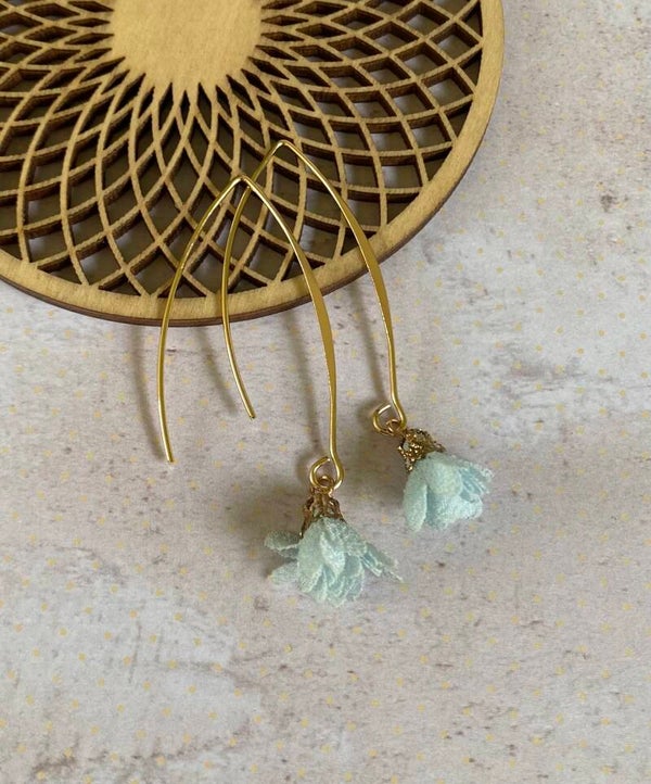 Een klein, schattig, stoffen bloemetje aan een lang, goudkleurig, nikkelvrij oorhaakje.