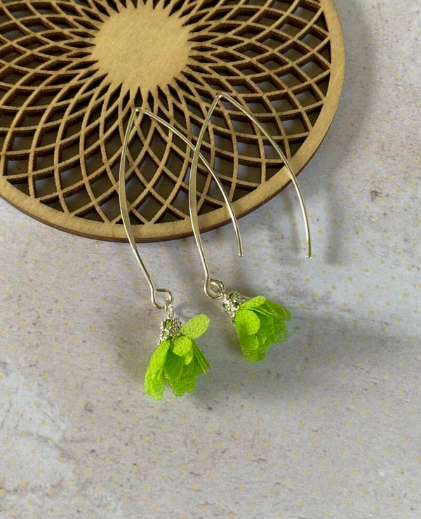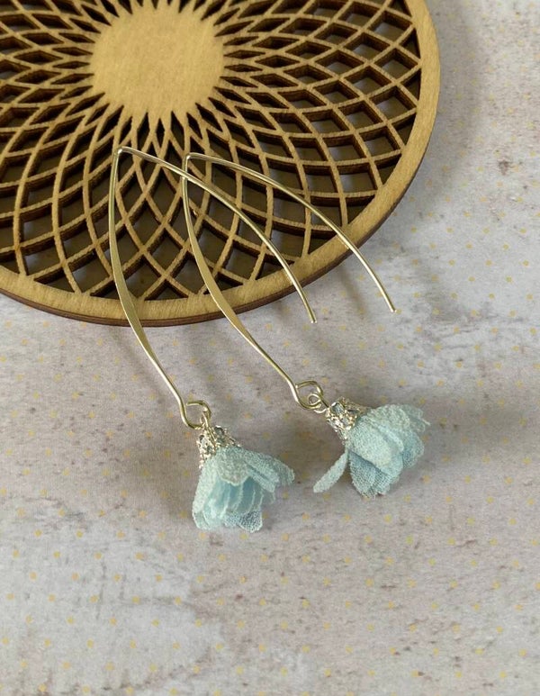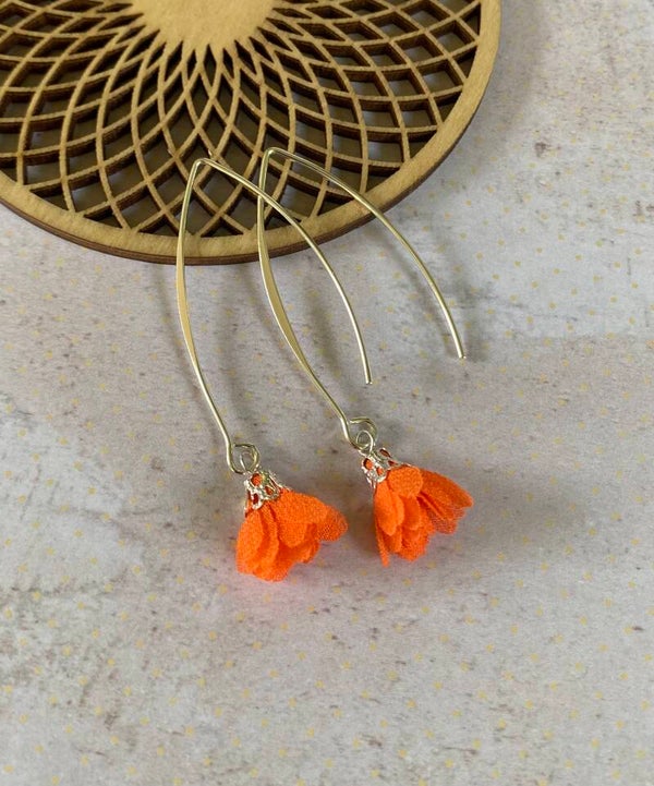 Een klein, schattig, stoffen bloemetje aan een lang, zilverkleurig, nikkelvrij oorhaakje.