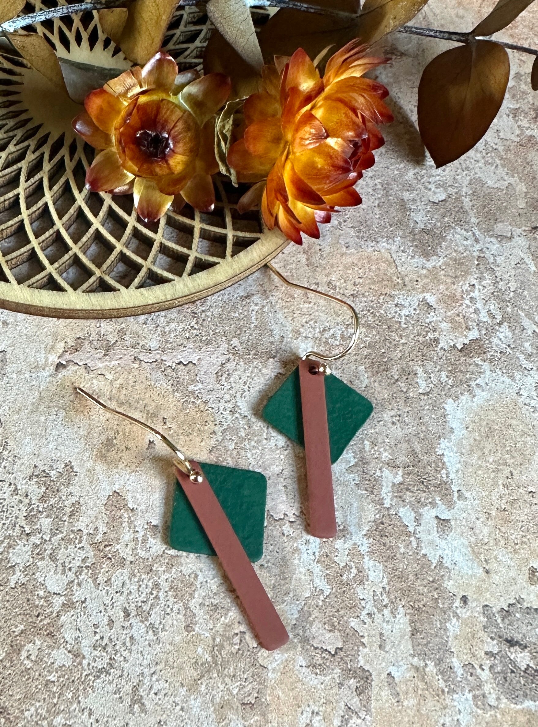 Nikkelvrije, goudkleurige oorhangers met daaraan ruitjes en staafjes met rubbercoating in contrasterende kleuren.