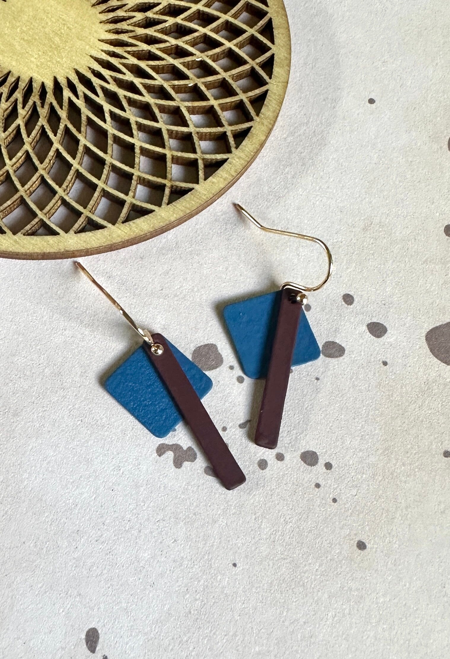 Nikkelvrije, goudkleurige oorhangers met daaraan ruitjes en staafjes met rubbercoating in contrasterende kleuren.