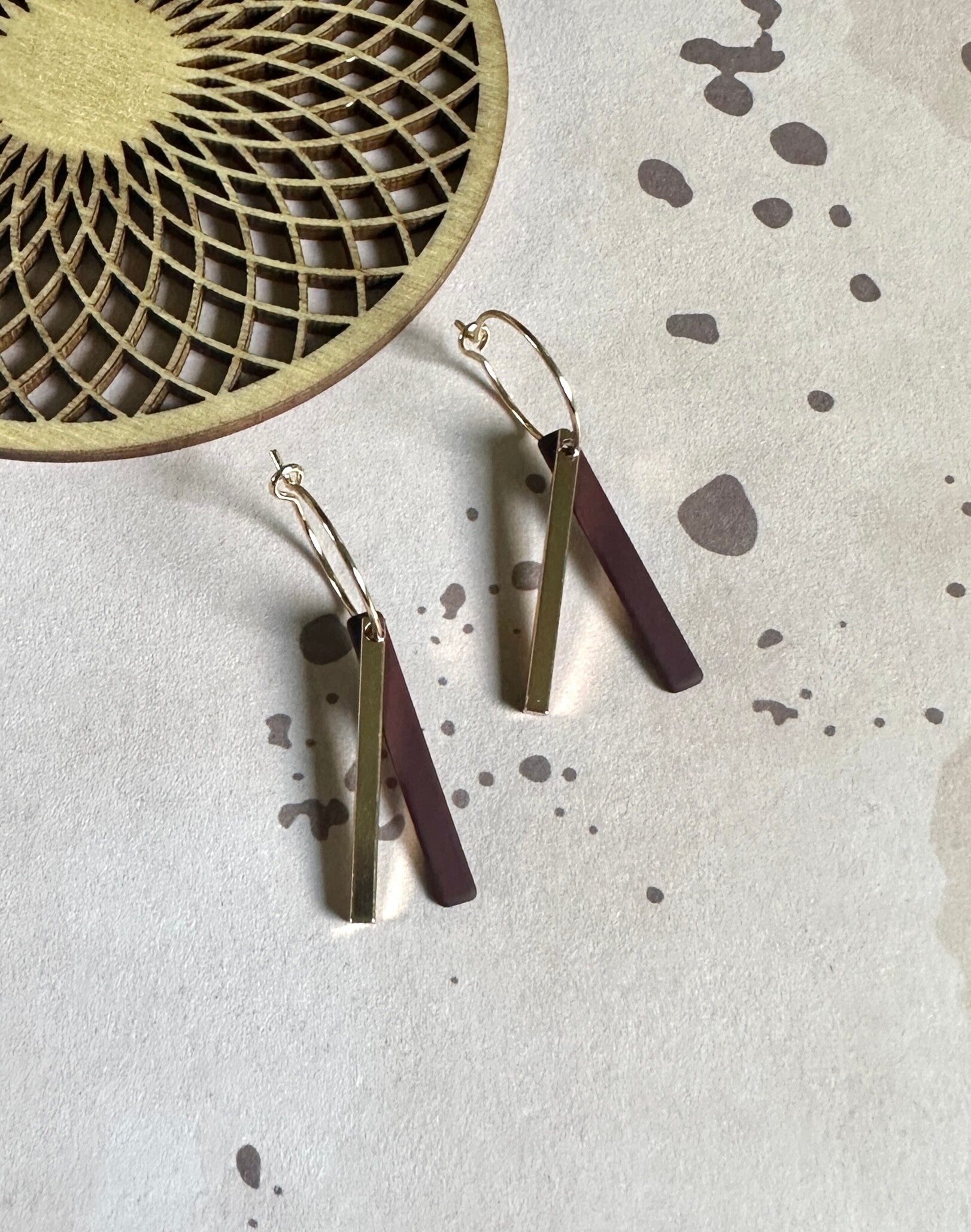Goudkleurige oorringen van 15mm met daaraan een gerubbercoat staafje in de kleur porto en een gouden, breder staafje.Alle onderdelen zijn nikkelvrij!