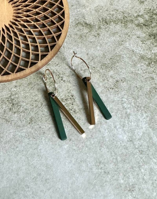 Goudkleurige oorringen van 15mm met daaraan een gerubbercoat groen staafje en een gouden, breder staafje.Alle onderdelen zijn nikkelvrij!