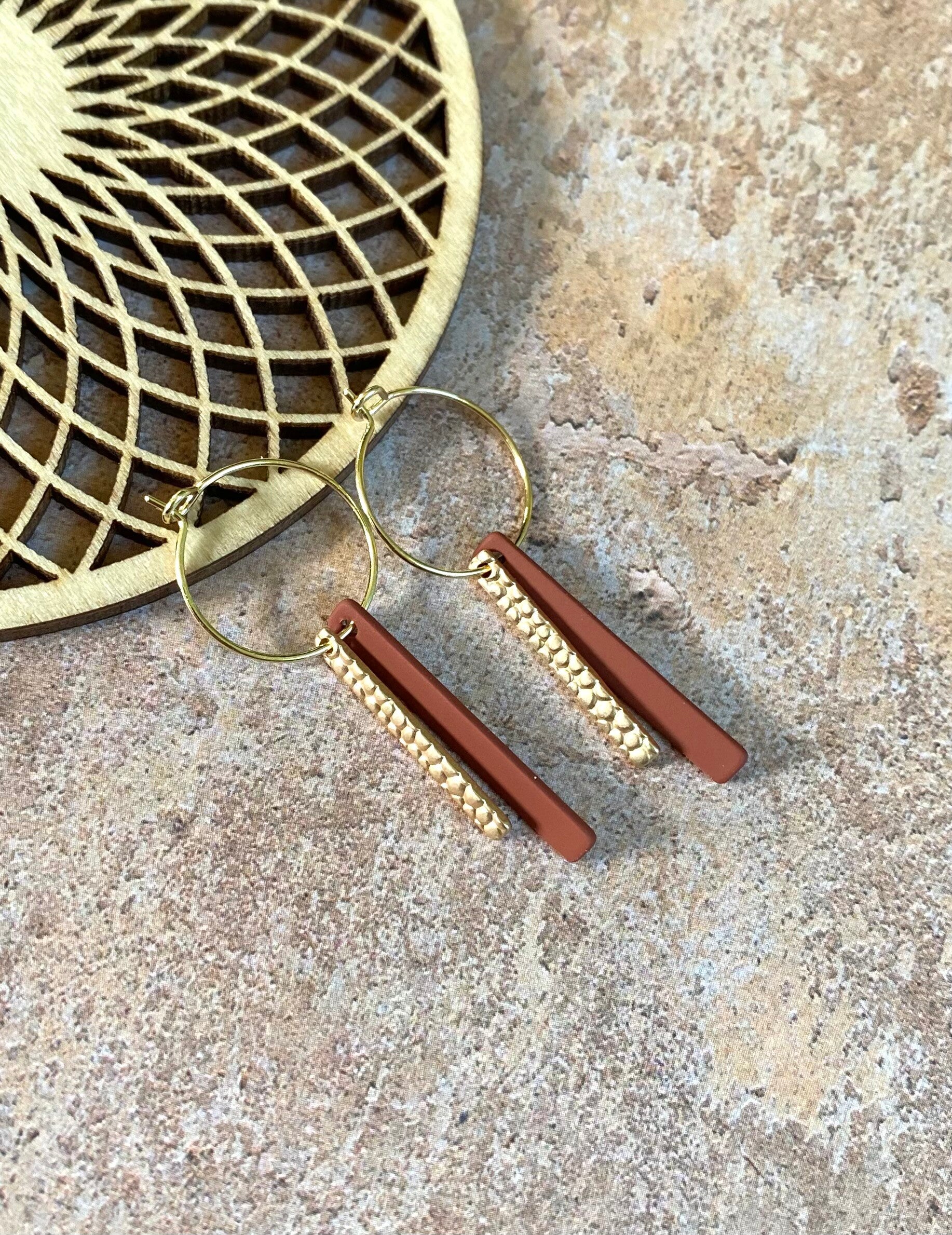 Nikkelvrije, goudkleurige oorringen van 15mm met daaraan een gebutst, nikkelvrij staafje en een gerubbercoat staafje in vosjeskleur :)
