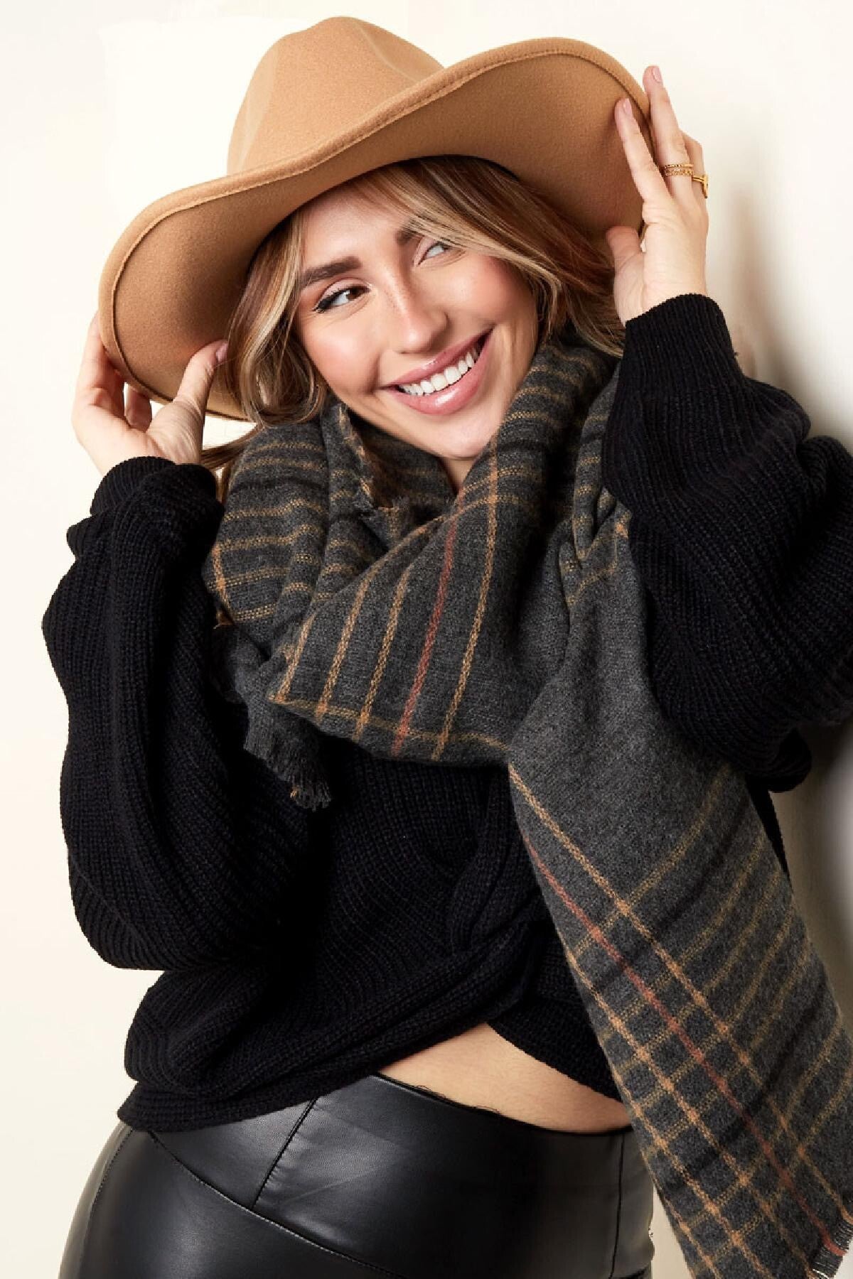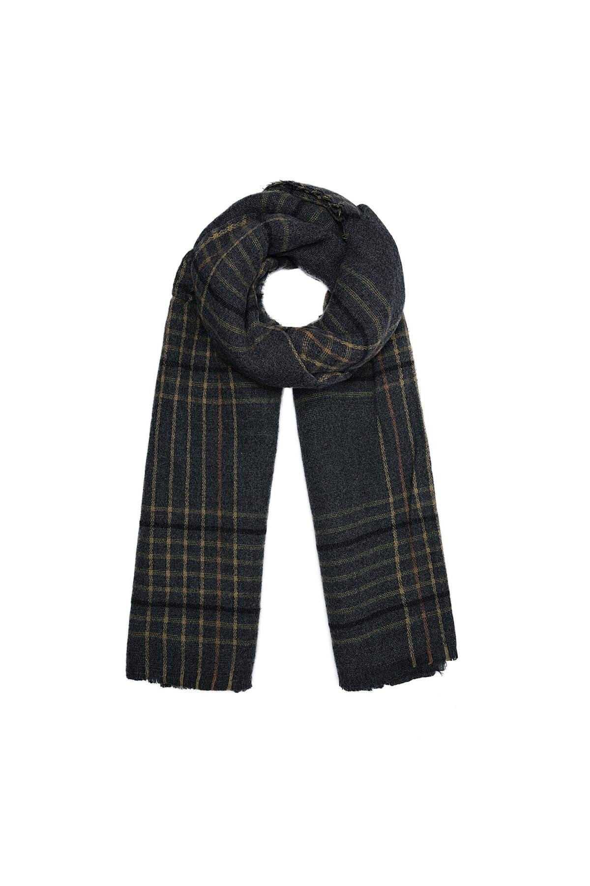 Deze heerlijke wintersjaal is versierd met beige en oranje strepen die een geblokt effect geven.