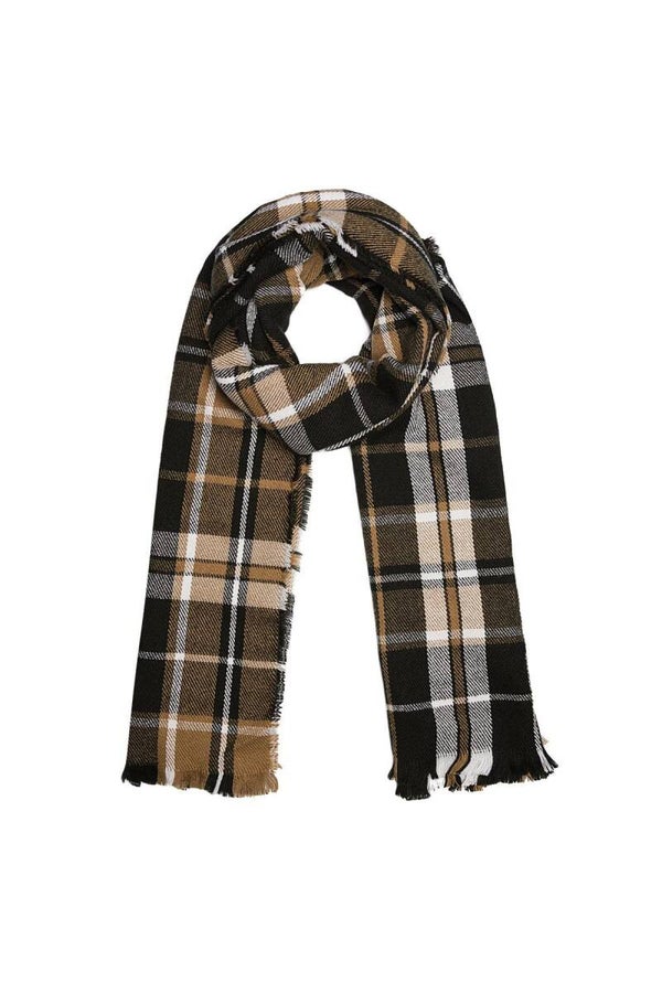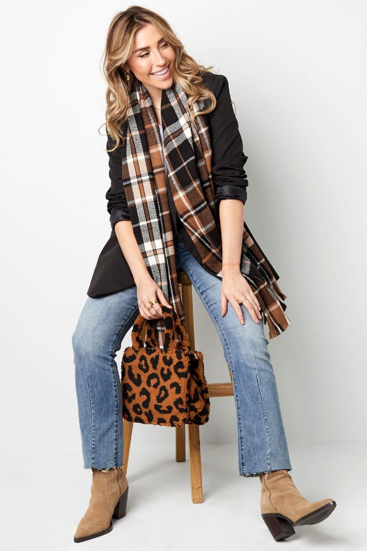 Maak jouw najaarscollectie compleet met deze heerlijk zachte en warme sjaal in zwart/bruin/beige ruitpatroon.
