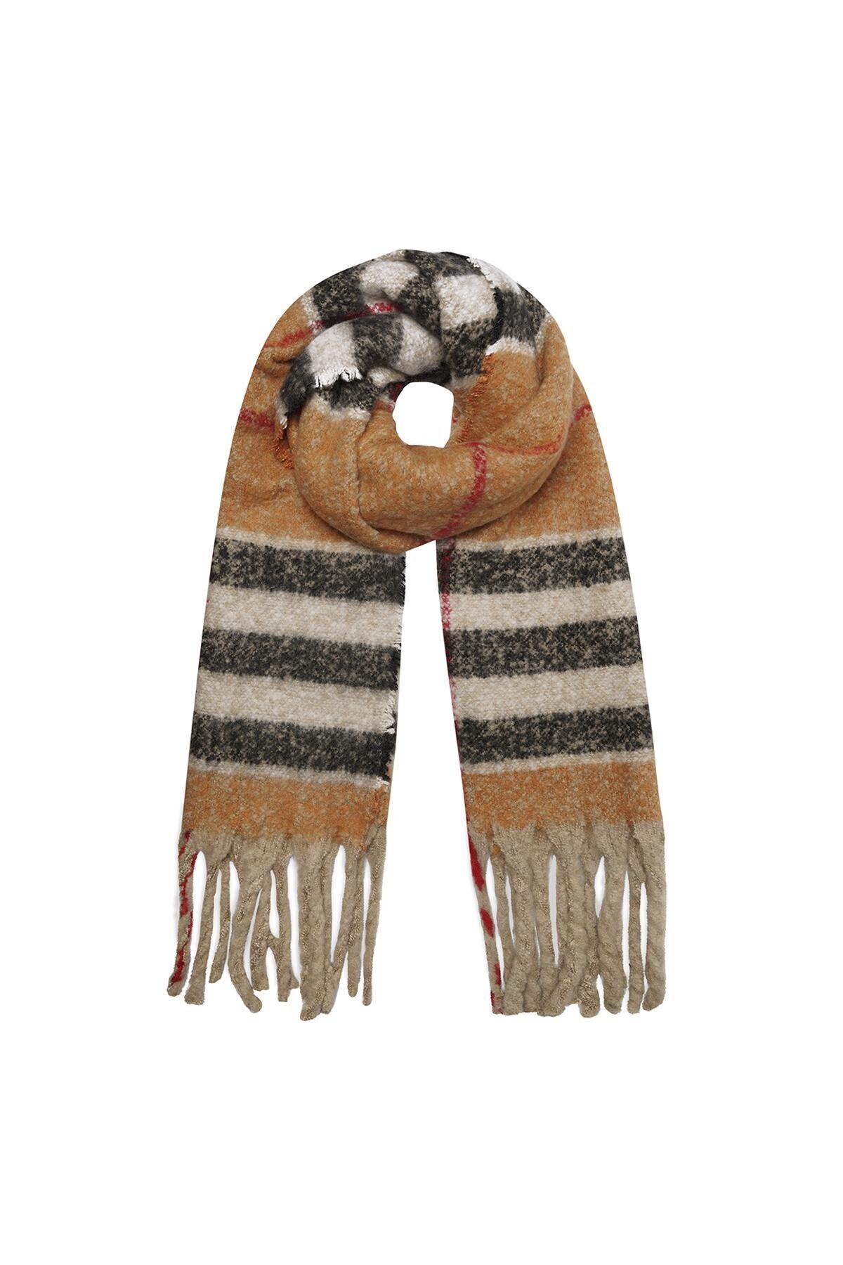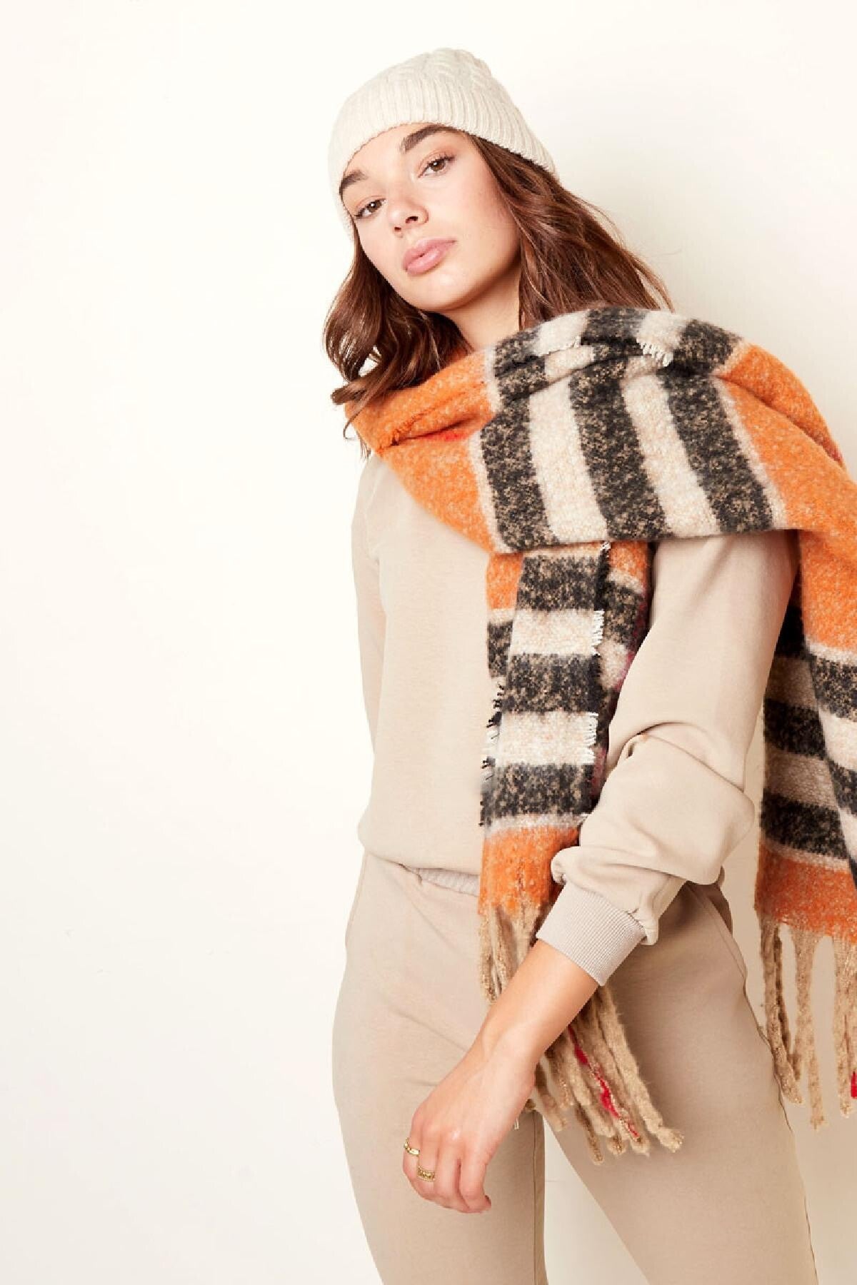 Het patroon bestaat uit verschillende strepen in oranje, zwart en beige met daardoorheen een lijn in het rood.