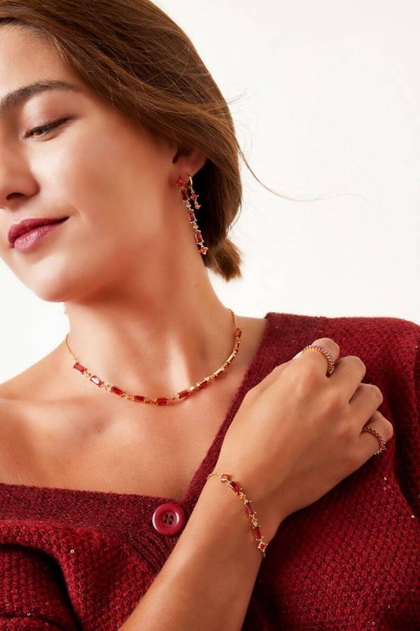 Blinky goudkleurige armband met fuchsia en oranje gekleurde zirkonium steentjes. De armband is nikkelvrij en is gold plated. Hij is 16cm lang en kan verlengd worden tot 19cm.