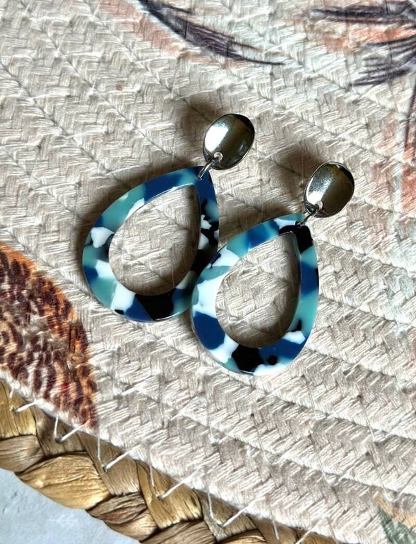 Een blauw-wit gemarmerde, druppelvormige hanger van resin hangt aan een zilverleurig, roestvrijstalen oorstekertje.Circa 4,5cm lang en licht van gewicht.