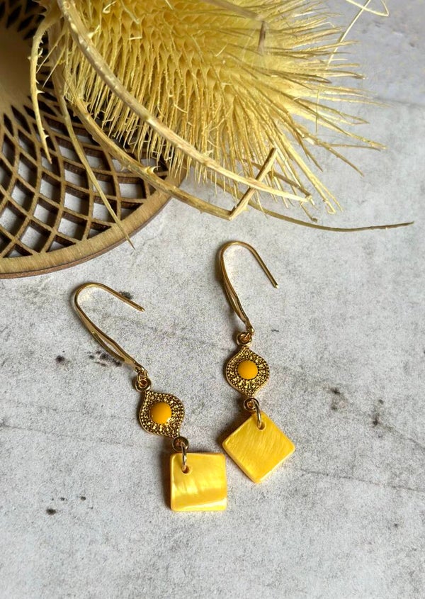 Een felgele, ruitvormig hangertje gemaakt van rivierschelp en een mooi tussenelementje hangen aan een roestvrijstalen oorhaakje.Speels & licht om te dragen!