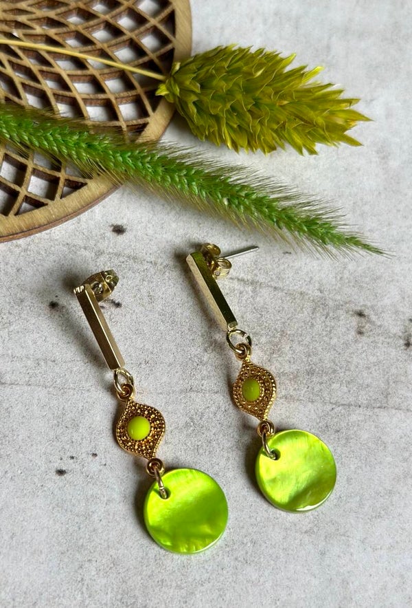 Een neon groen, rond hangertje gemaakt van rivierschelp en een mooi tussenelementje hangen aan een oorstekertje van nikkelvrij DQ metaal.Speels & licht om te dragen!