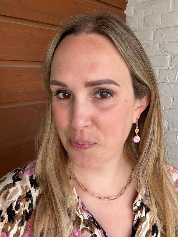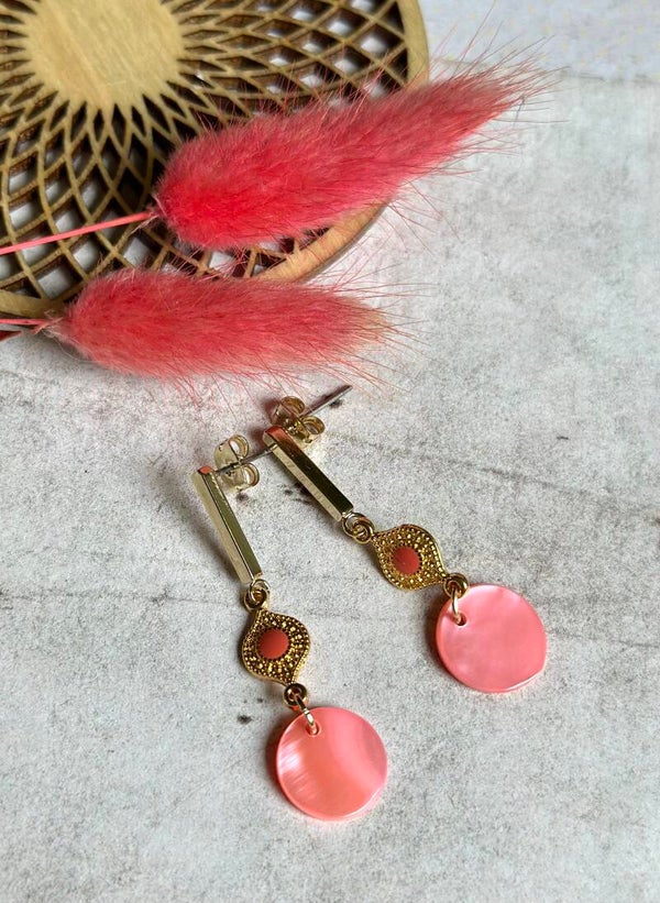 Een koraalkleurig, rond hangertje gemaakt van rivierschelp en een mooi tussenelementje hangen aan een oorstekertje van nikkelvrij DQ metaal.Speels & licht om te dragen!