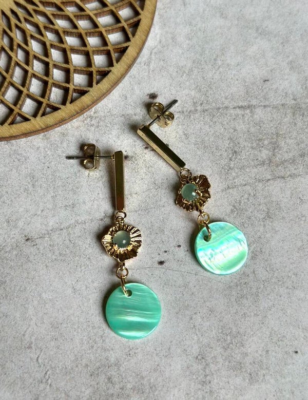 Een turquoise, rond hangertje gemaakt van rivierschelp en een mooi tussenelementje hangen aan een oorstekertje van nikkelvrij DQ metaal.Speels & licht om te dragen!