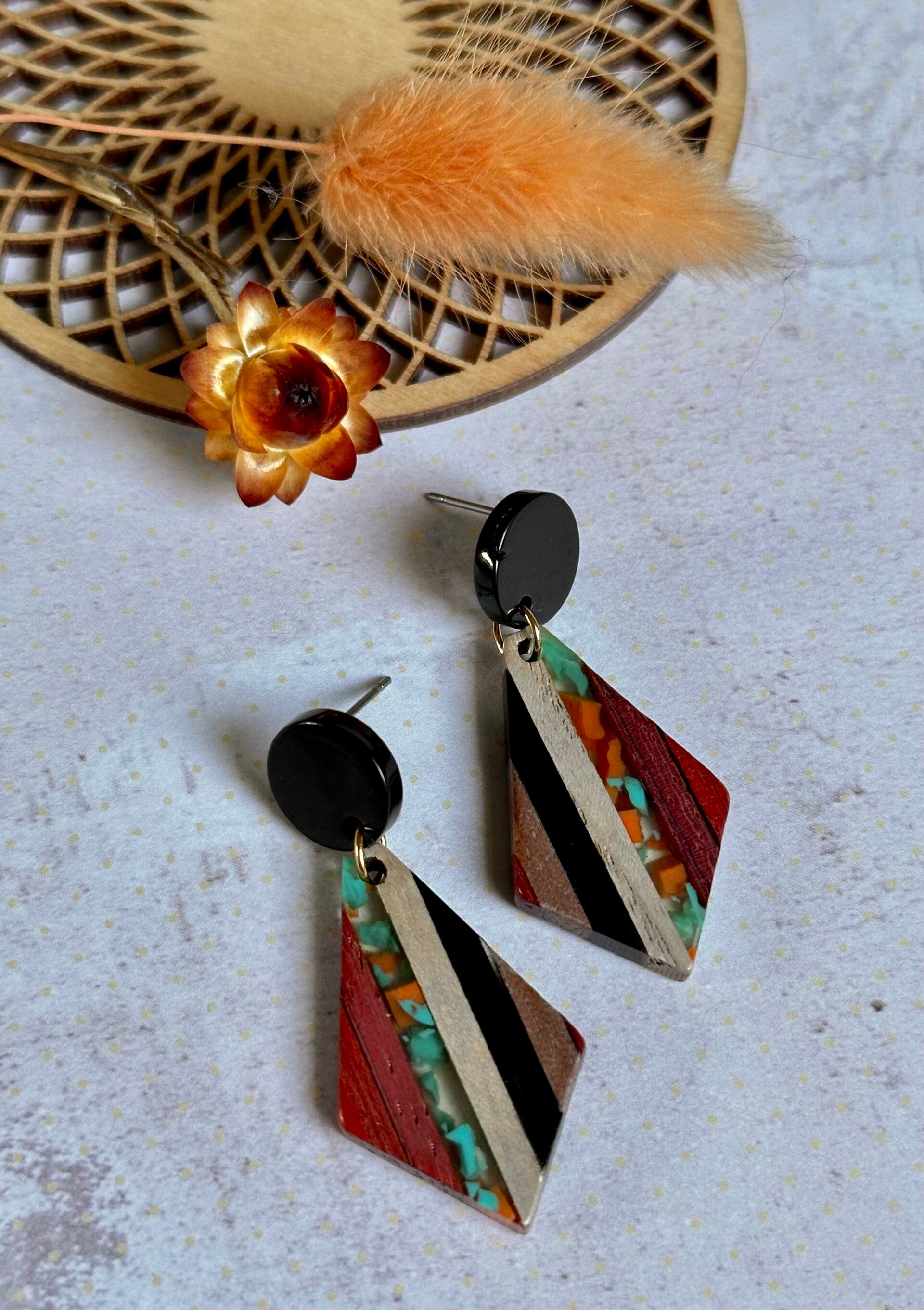 Een mooie ruitvormige hanger van hout en resin in prachtige herfsttinten hangt aan een gitzwarte, nikkelvrije oorsteker. Je hebt de keuze tussen een zilverkleurig of goudkleurig verbindingsringetje. Draagt heel licht!
