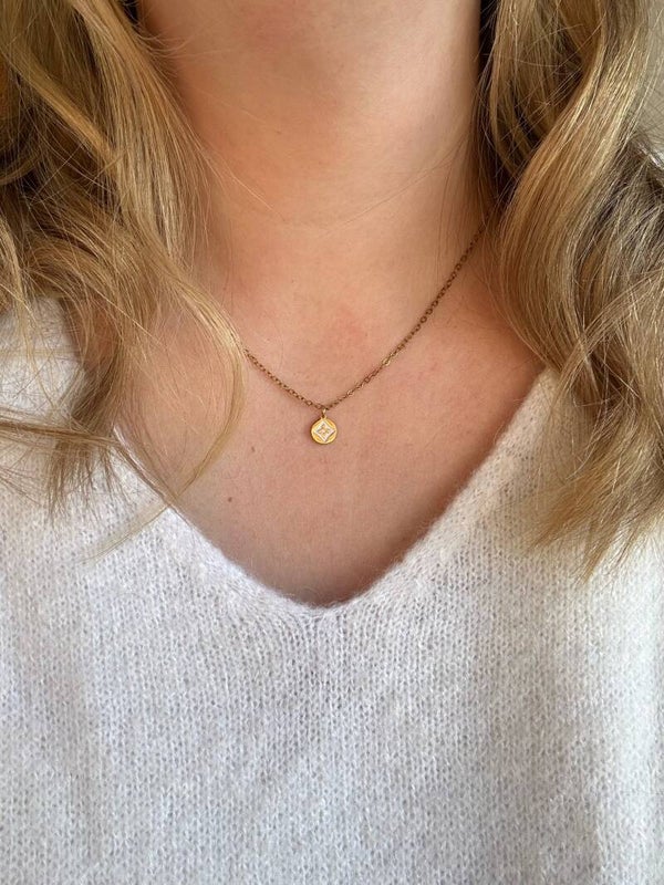 Een mooie hanger van RVS en witte email (enamel) geïnspireerd op het bloempje van Louis Vuitton aan een RVS ketting van 45 cm lang (+ 5cm verlengketting).