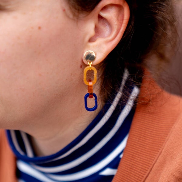 Totale lengte: 4,8 cmTotale breedte: 1,1 cmMateriaal: Gold plated, nikkelvrije messing, acrylKleur: Cognac en donkerblauw