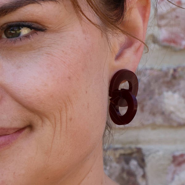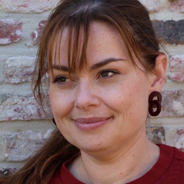 Totale lengte: 3,6 cmTotale breedte: 2,3 cmMateriaal: Gold plated, nikkelvrije messing, acrylKleur: bordeaux