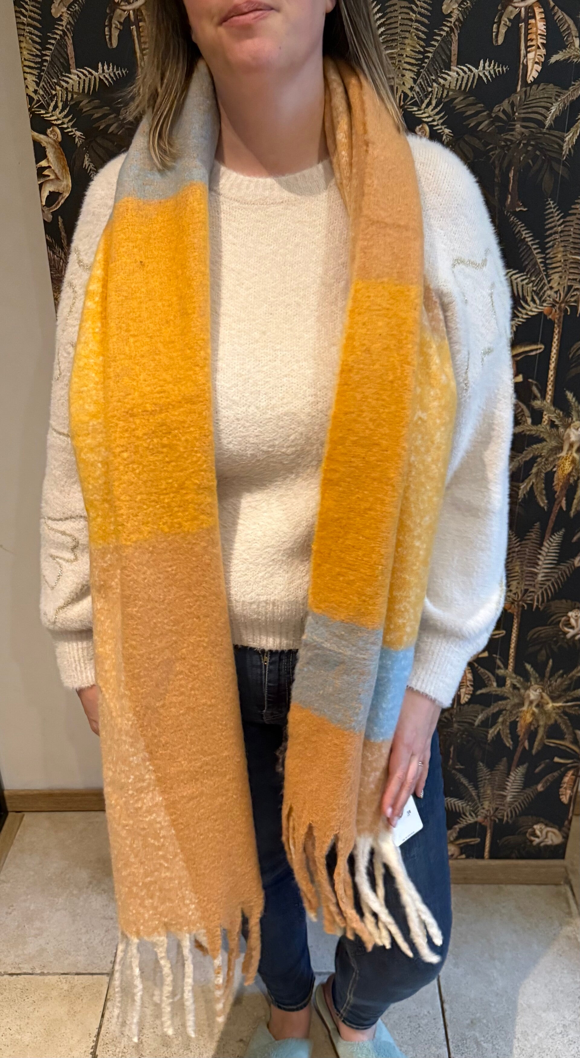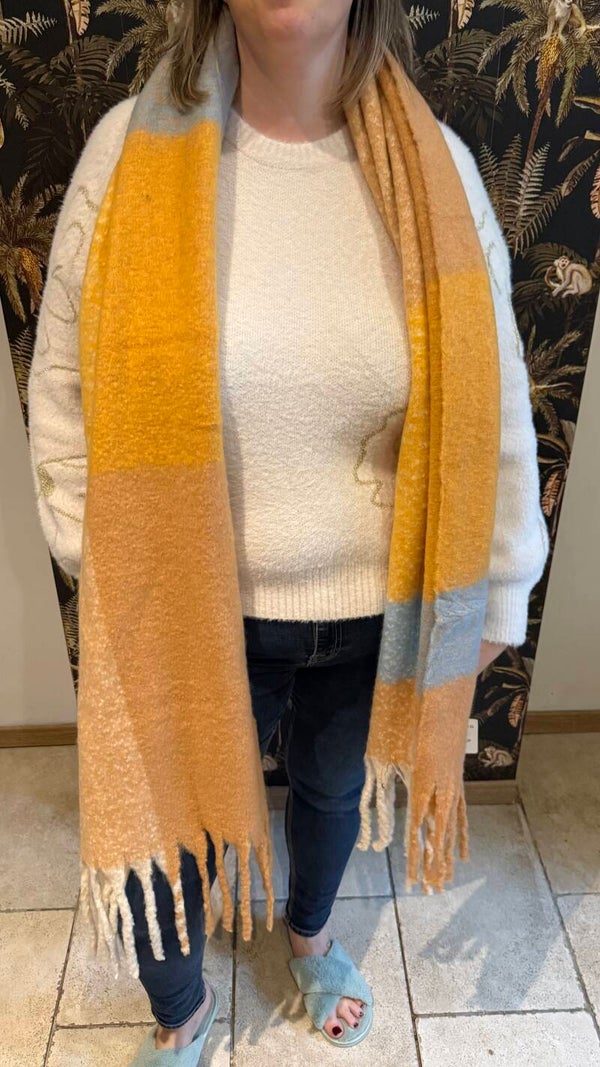 Mooie wintersjaal met vlakken in verschillende tinten geel en lichtblauw.