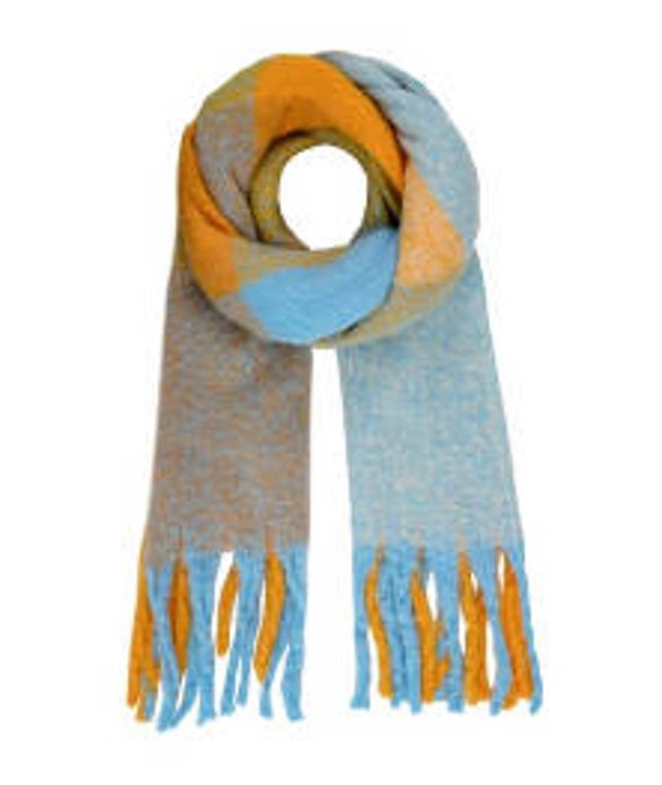 Mooie wintersjaal met vlakken in verschillende tinten geel en lichtblauw.