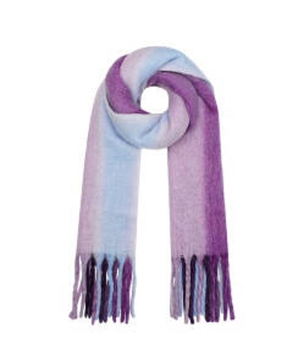 Een musthave voor je wintergarderobe is deze prachtige sjaal in blauwe en paarse tinten waarbij de kleuren in elkaar overlopen van licht naar donker.