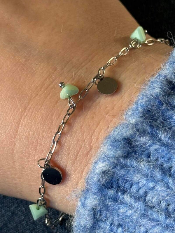 Leuk zilverkleurig armbandje van RVS met bedeltjes en mintkleurige kraaltjes..