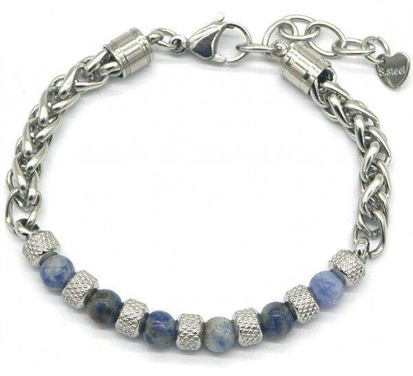 Zilverkleurige uniseks armband van RVS met 6cm kraaltjes van spotted blue stone en een verlengkettingkje.
