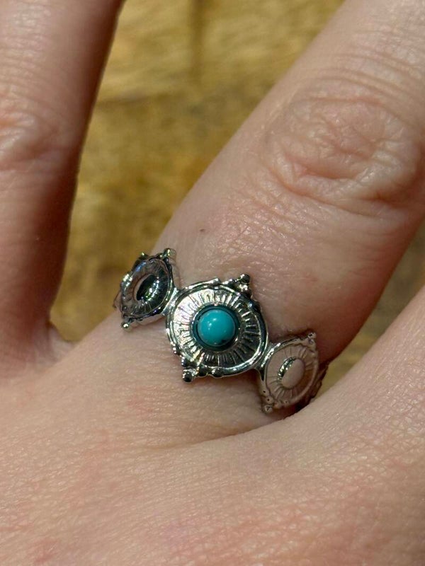 Zilverkleurige, verstelbare ring van stainless steel met een Turkoois steentje.