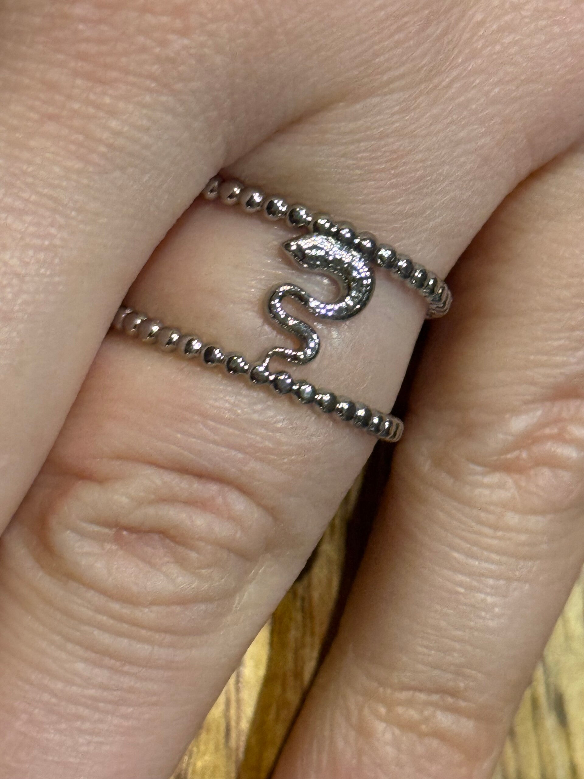 Zilverkleurige, verstelbare ring van stainless steel met een slang in het midden.1 size