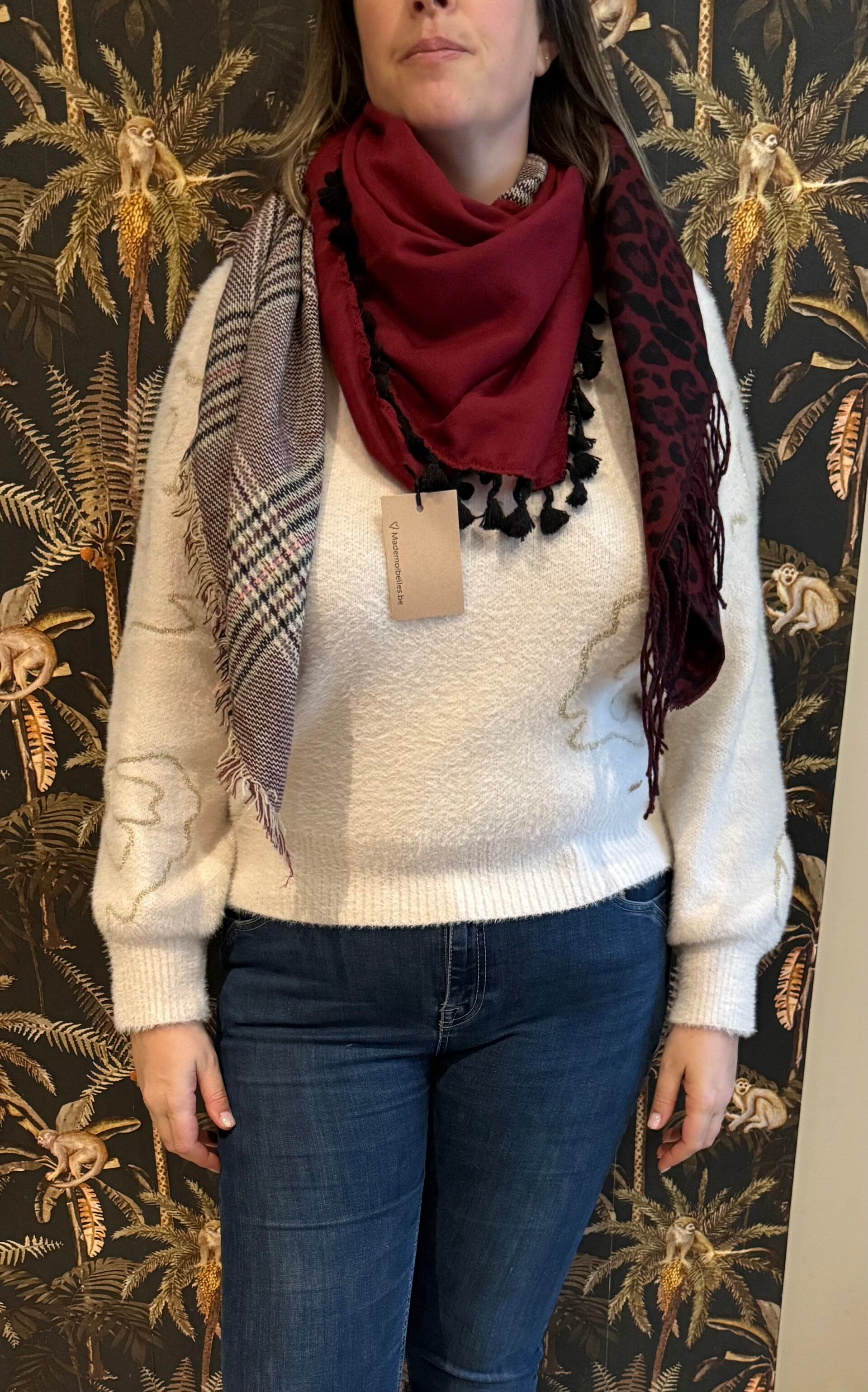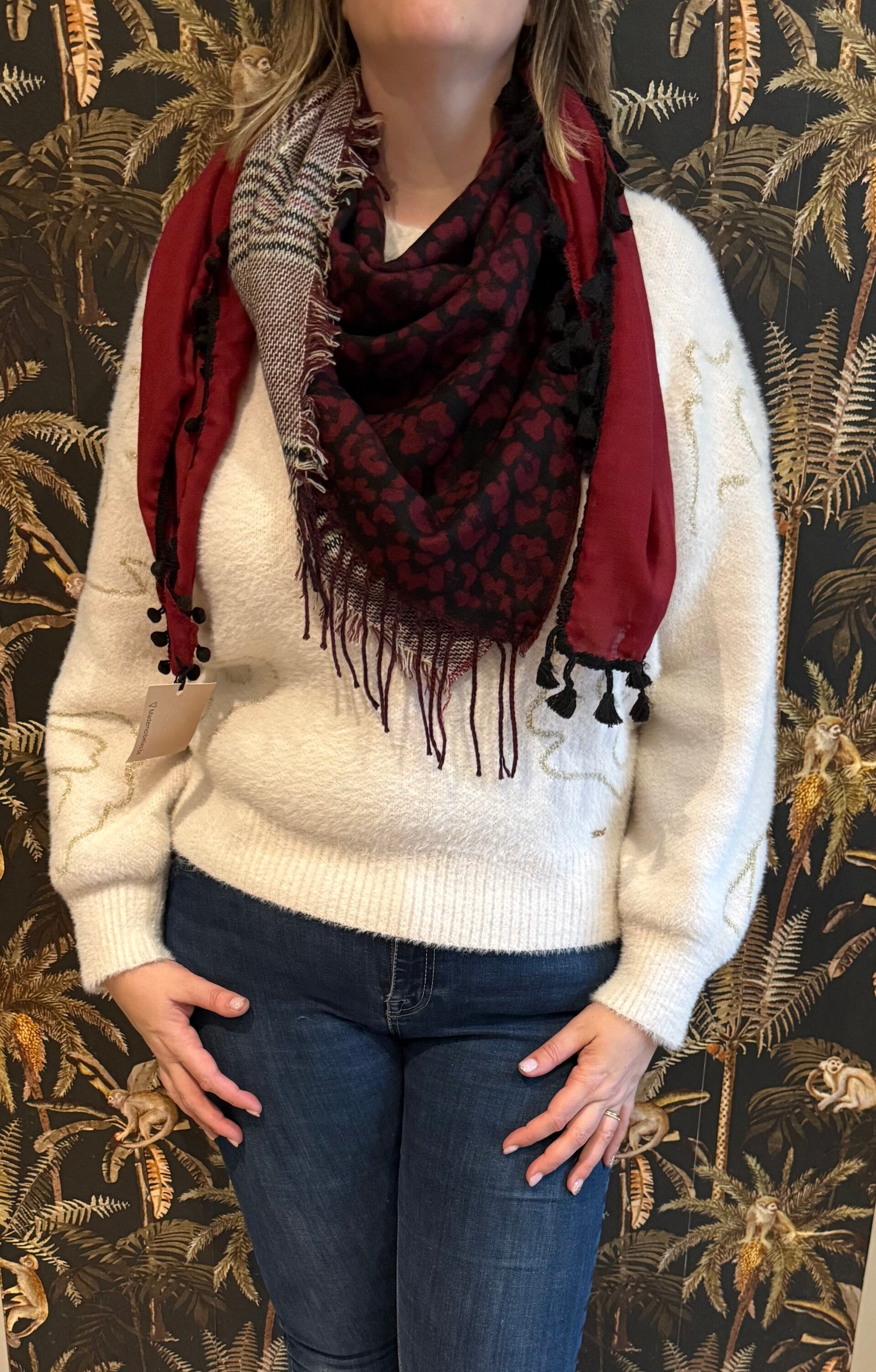 Rode sjaal met 2 effen vlakken en een careau -en luipaardprint.