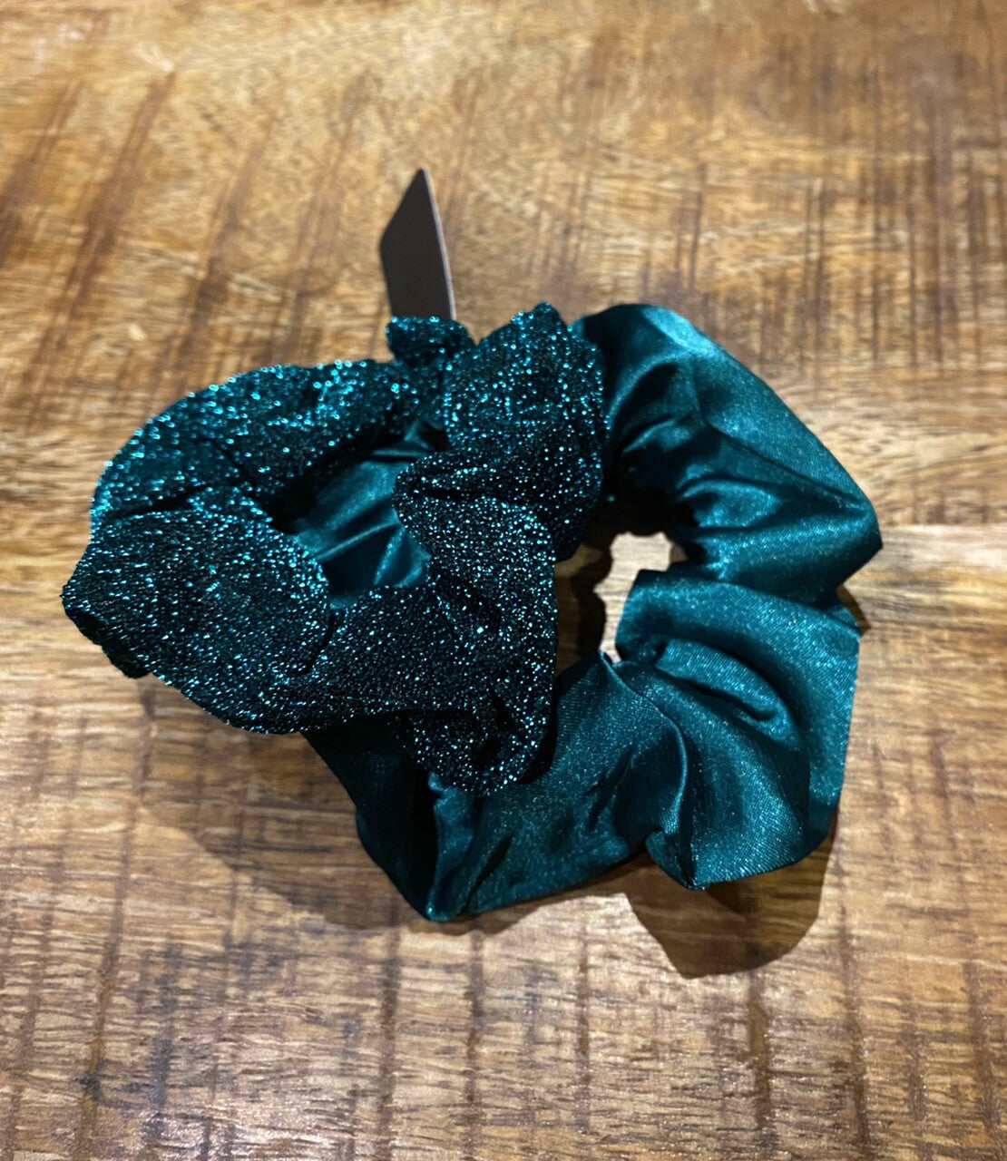 Deze leuke set van scrunchies bestaat uit een scrunchie van zijdeachtige stof en eentje van glitterstof.
