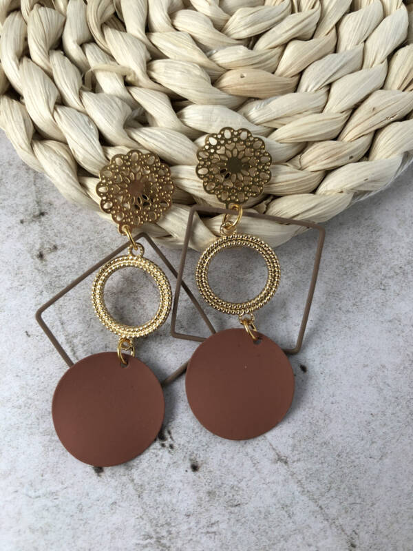 Goudkleurige, roestvrijstalen oorstekers gecombineerd met mooie hangertjes in bruin en goud.