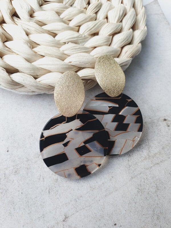 Goudkleurige roestvrijstalen stardust oorsteker gecombineerd met een ronde hanger in zwart en goud.