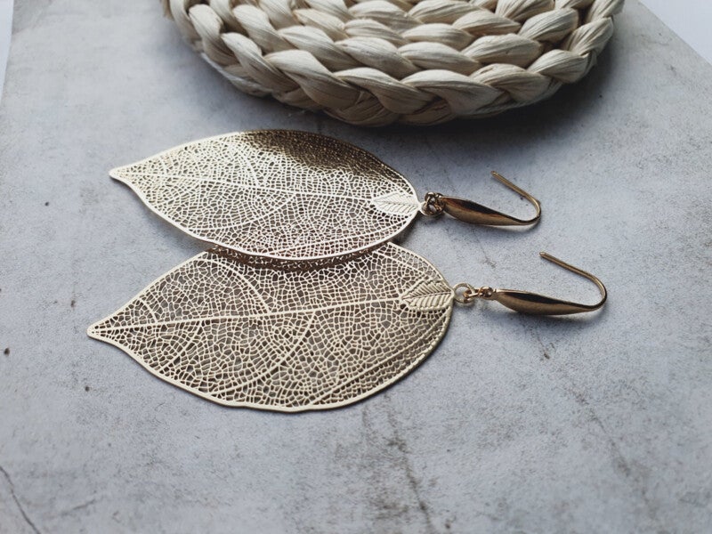 Deze prachtige hangers zijn gemaakt van echte bladeren waar een mooie coating over is gegoten. Ze hangen aan een roestvrijstalen goudkleurig oorhaakje. Héél elegant om te dragen!