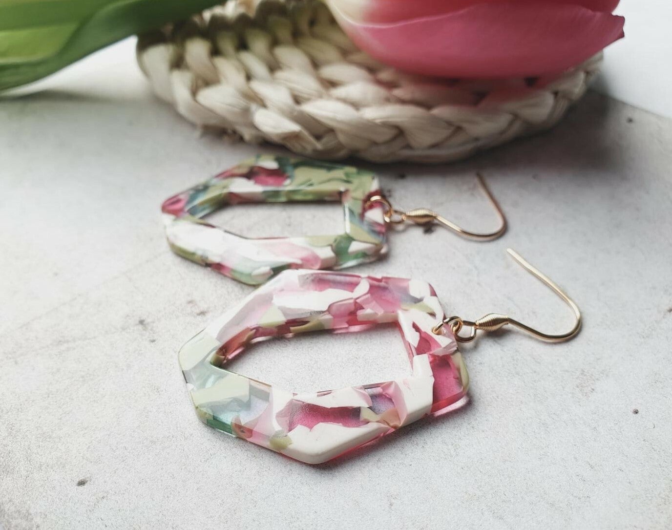 Goudkleurige roestvrijstalen oorstekers gecombineerd met een resin hanger in toffe lente kleuren.