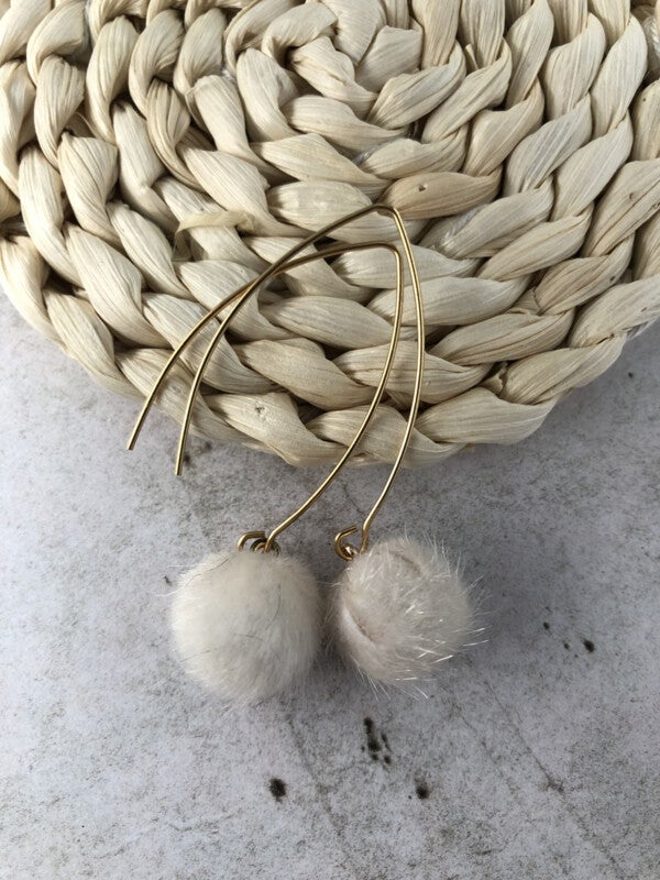 Roestvrijstalen goudkleurige oorhangers gecombineerd met witte pluchen bolletjes. Super schattig & leuk!