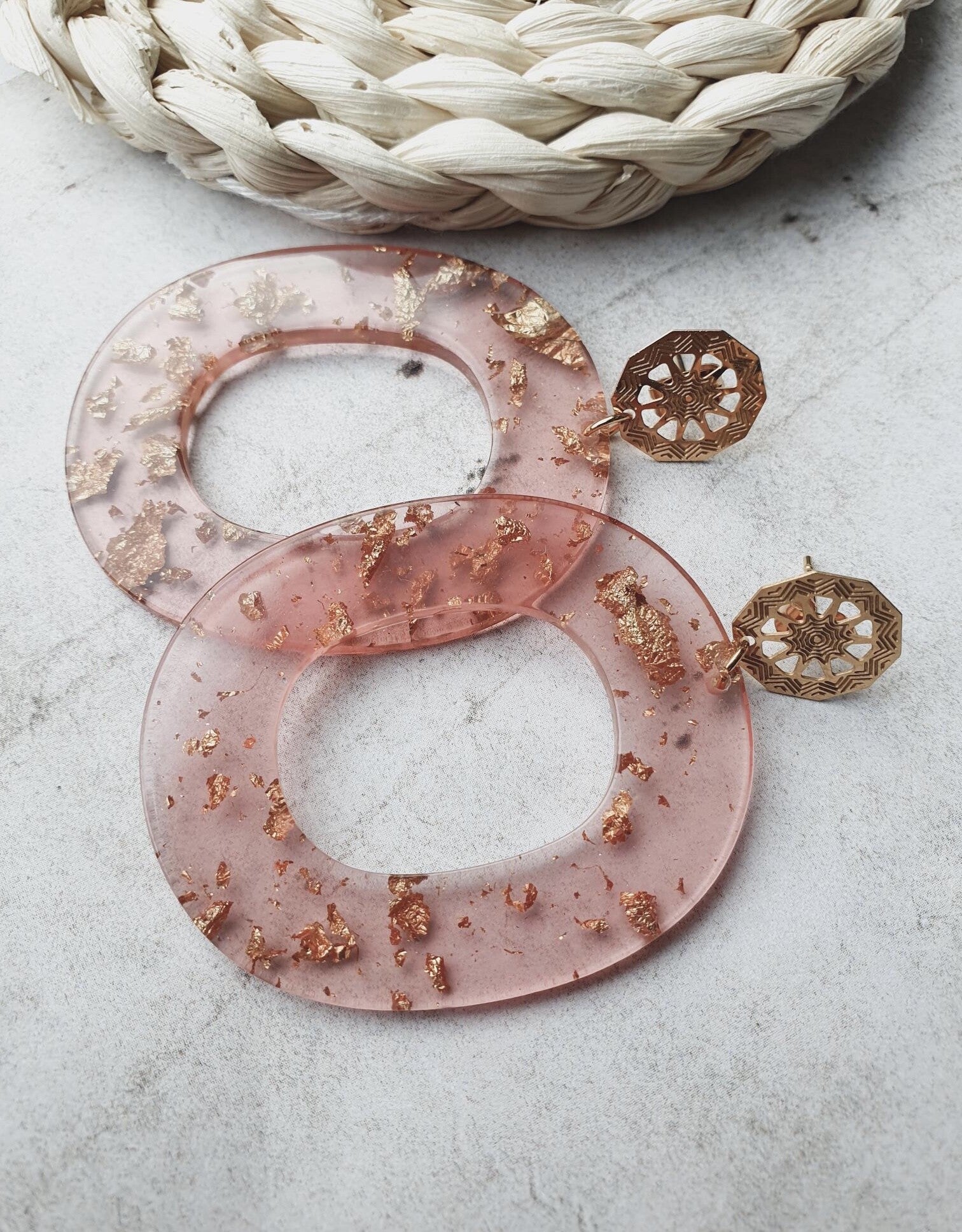Een mooie resin hanger in transparant roze met gouden flakes gecombineerd aan een roestvrijstalen goudkleurige oorsteker.