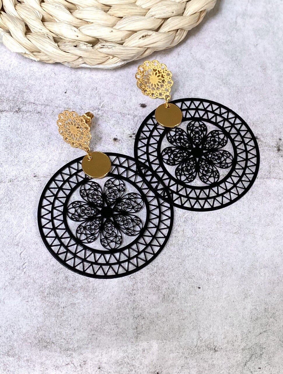 Deze nikkelvrije gitzwarte filigraan hangers werden gecombineerd met een goudkleurige roestvrijstalen bohemian oorsteker en afgewerkt met een nikkelvrij element.