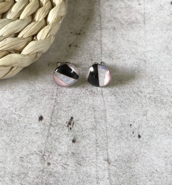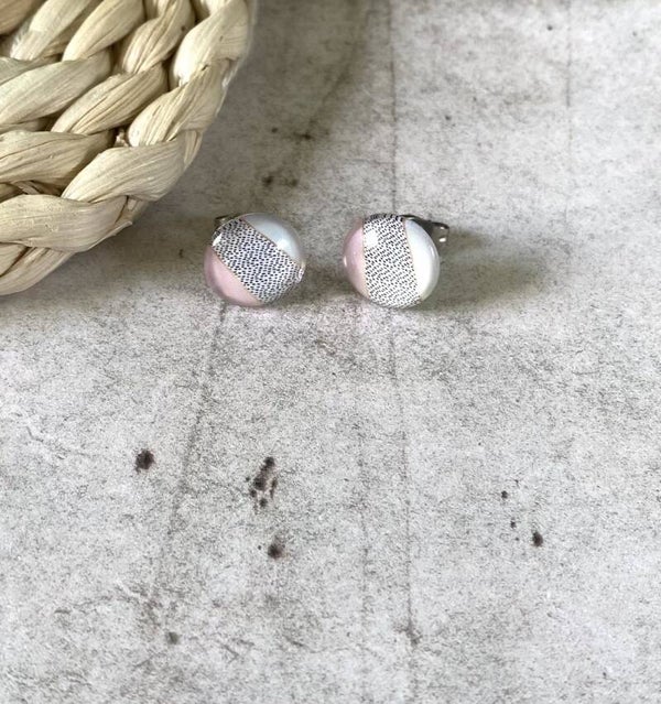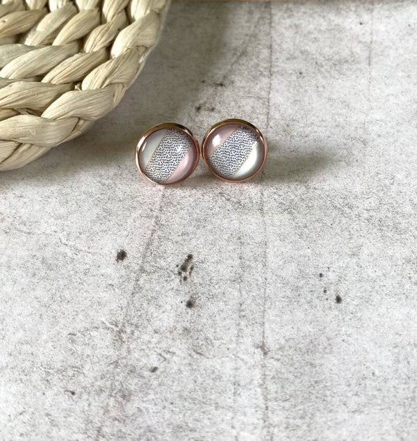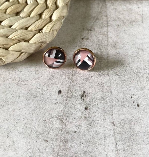 Oorknopjes Geometrisch roze zijn er telkens in 3 tekeningen en zijn mogelijk met of zonder rosékleurige setting.Ook deze zijn 12 mm groot.