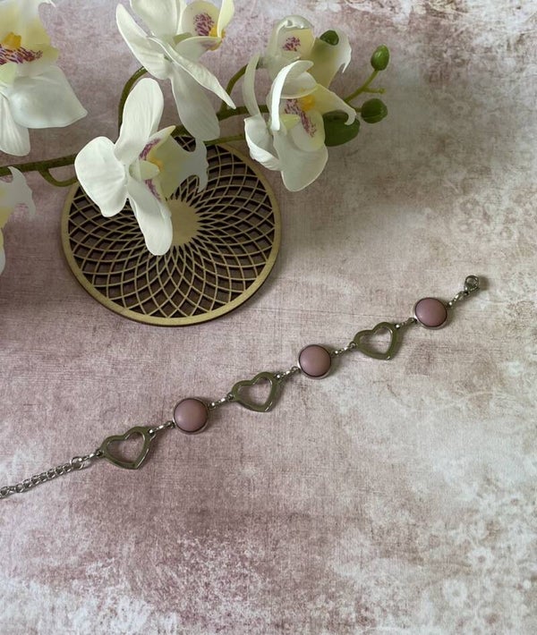 Ziverkleurige roestvrijstalen armband met matte roze cabochons van 12 mm, in lengte verstelbaar.