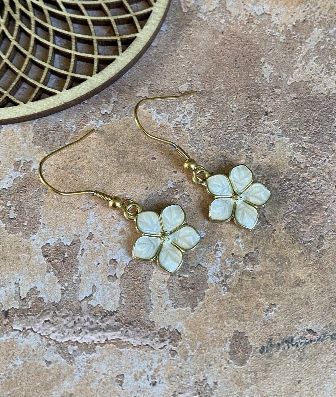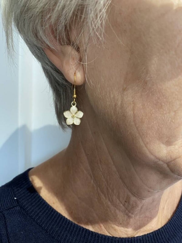 Goudkleurige nikkelvrije hangers in de vorm van een bloem in email aan roestvrijstalen oorhaakjes. Je hebt de keuze tussen verschillende kleuren bloemen.Super licht van gewicht.Ongeveer 3,5cm lang.
