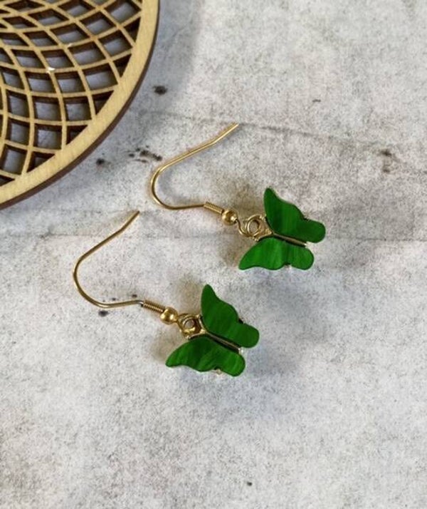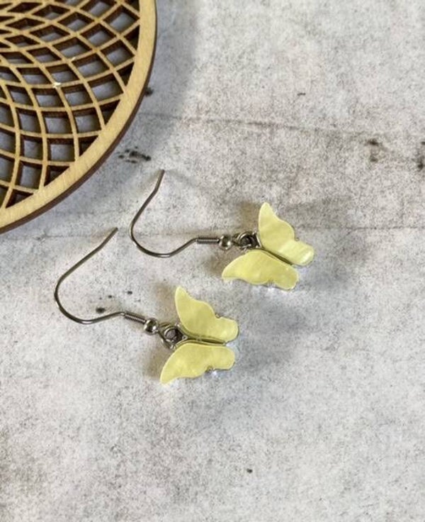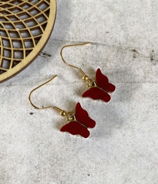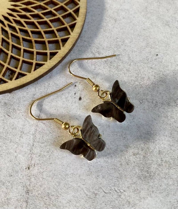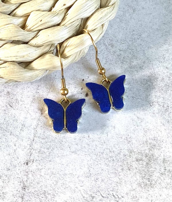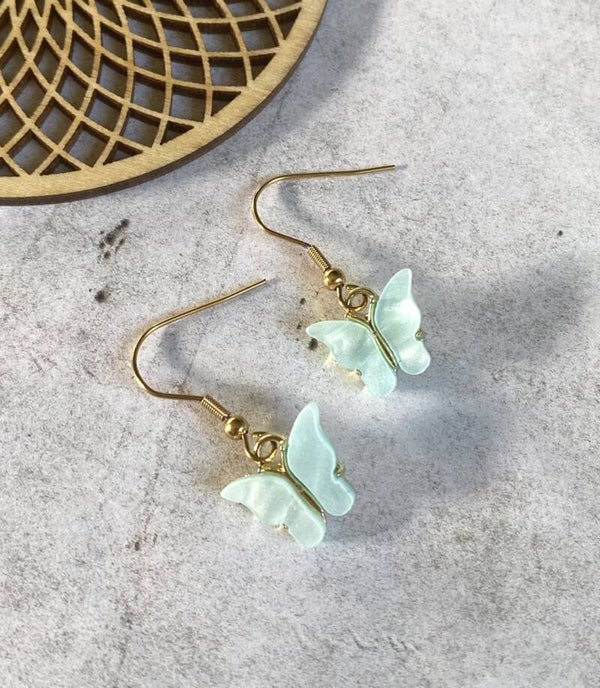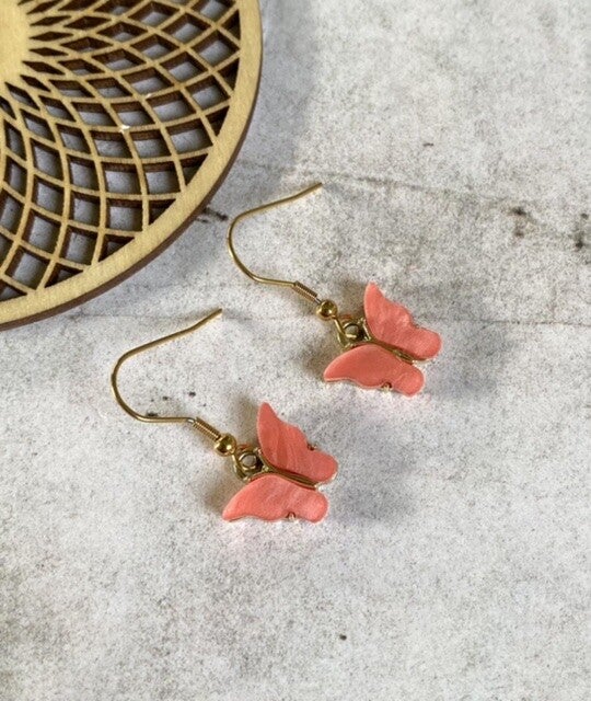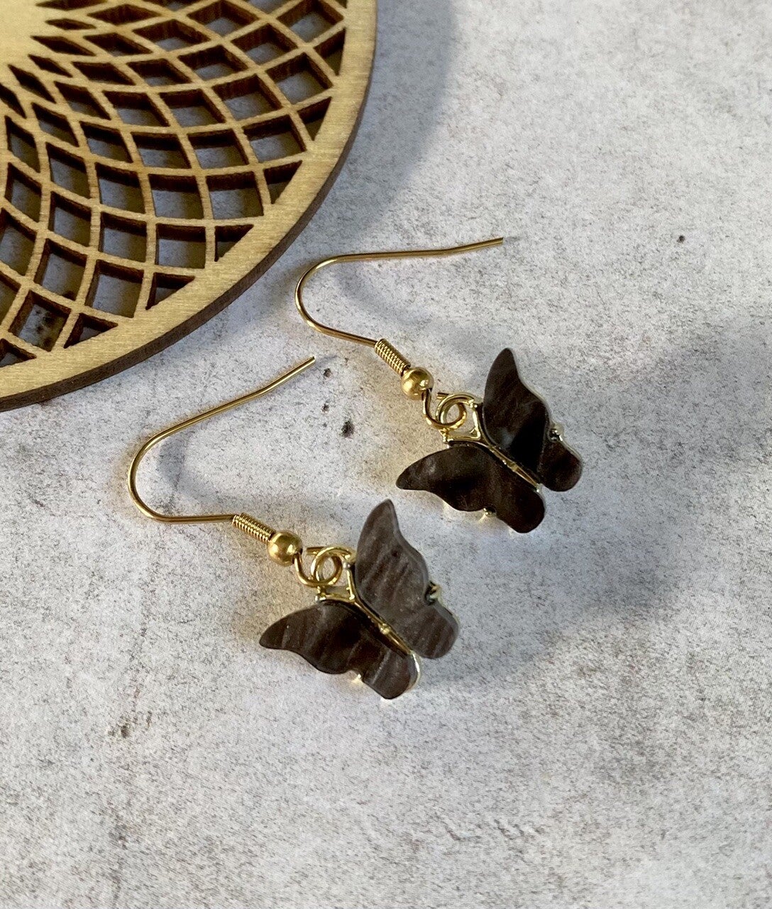 Goudkleurige nikkelvrije brassmetalen hangers in de vorm van een vlinder in resin aan roestvrijstalen oorhaakjes.