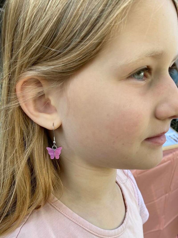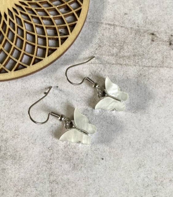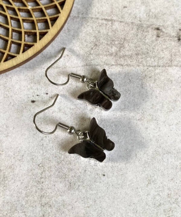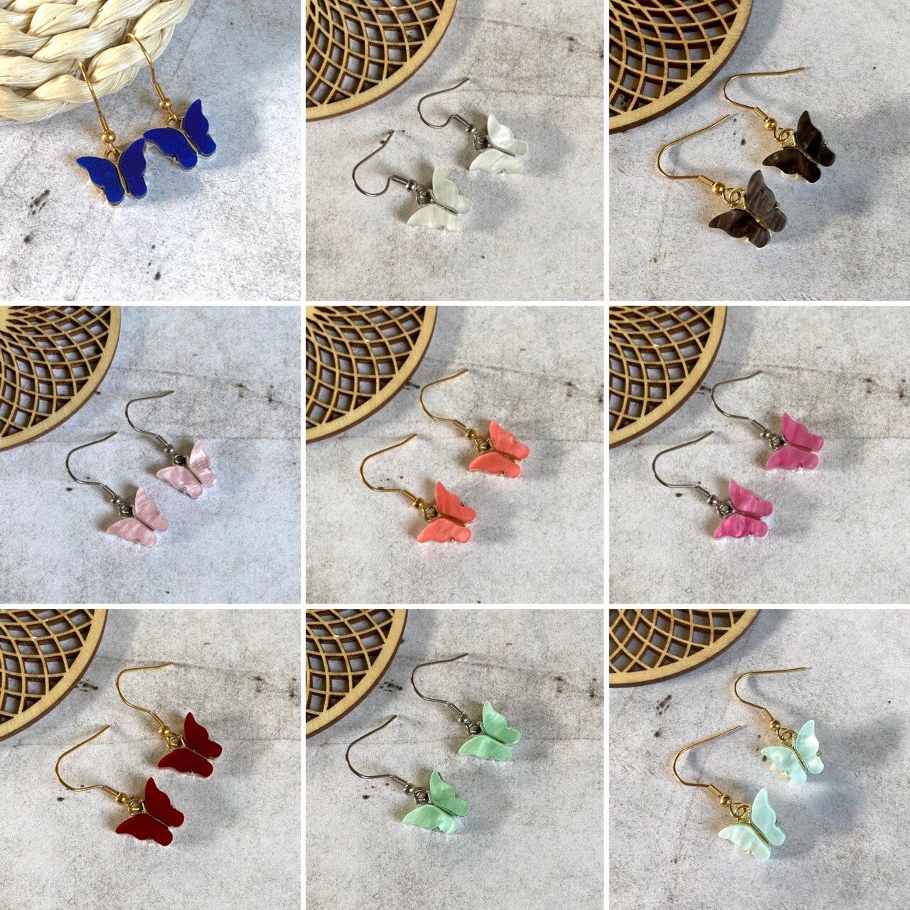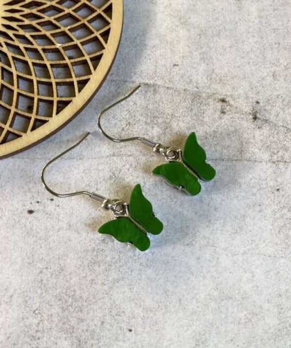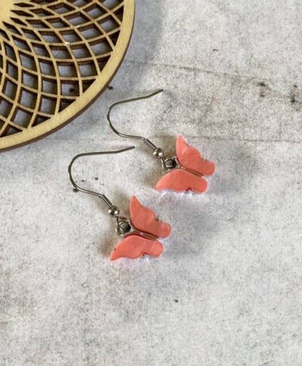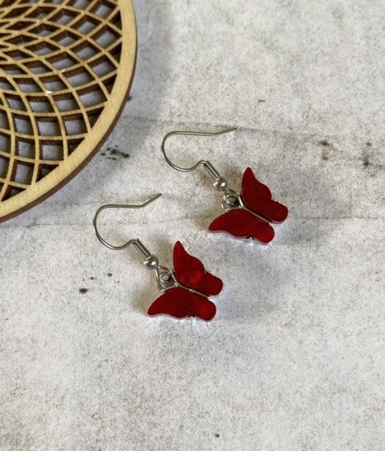 Goudkleurige nikkelvrije brassmetalen hangers in de vorm van een vlinder in resin aan roestvrijstalen oorhaakjes.