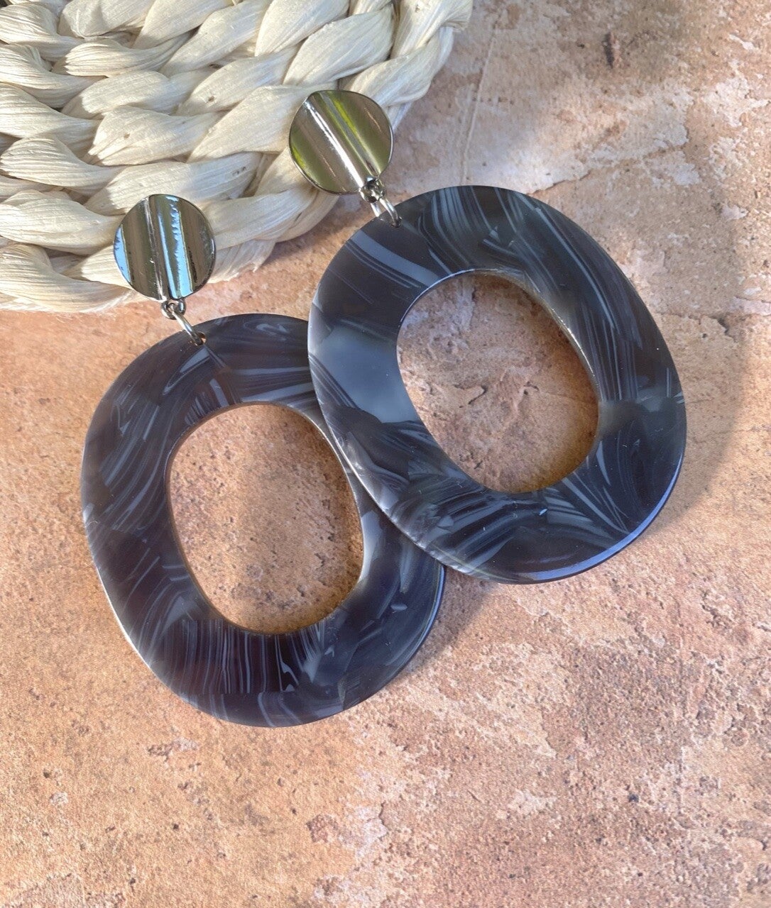 Deze supermooie antraciet gemarmerde ovalen hangers werden gecombineerd met rodium gecoate oorstekers die lood-, nikkel- en cadmiumvrij zijn.